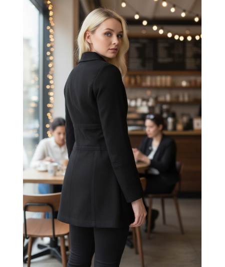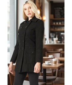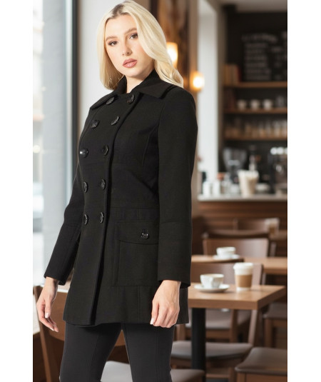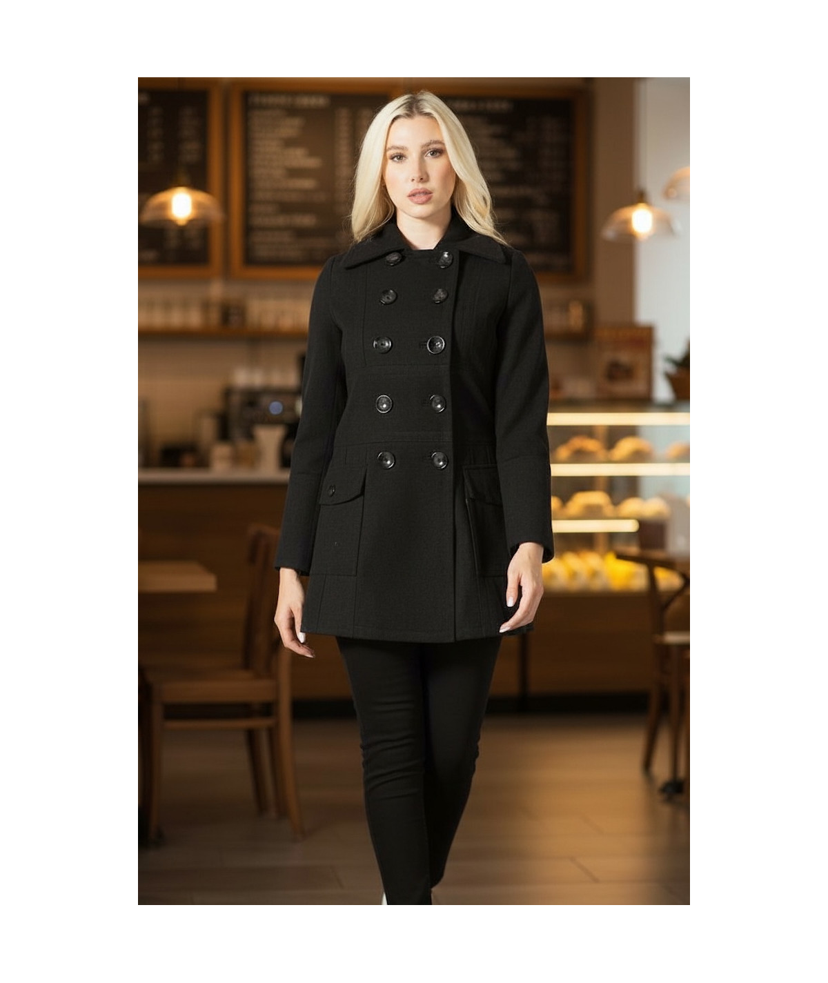 Abrigo para mujer en color negro con diseño clásico de doble botonadura. Presenta cuello tipo solapa, bolsillos frontales con tapa y corte recto que estiliza la figura sin perder comodidad. Elaborado en tejido abrigado ideal para otoño e invierno, perfecto para looks de oficina, salidas formales o combinaciones urbanas con pantalón y botines.