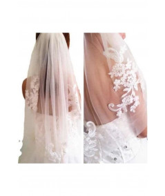 Este velo corto combina elegancia y ligereza con un diseño de tul translúcido y delicadas aplicaciones de encaje floral. Ideal para novias que buscan un toque romántico sin perder comodidad, complementando perfectamente vestidos de cualquier estilo. Su caída natural y su encaje sutil lo convierten en un accesorio versátil y refinado para el gran día.
