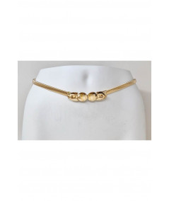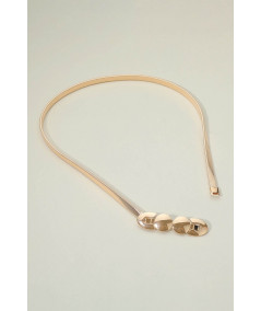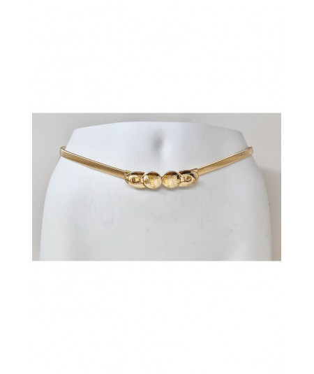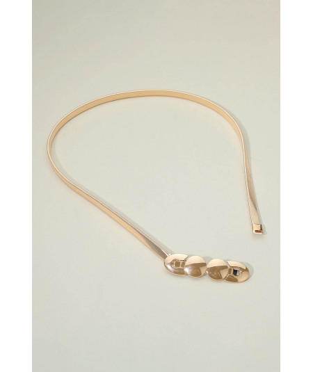 Cinturón dorado diseñado para realzar la cintura con un acabado moderno y pulido. Su estructura metálica aporta firmeza y estilo y su adorno frontal crea un punto focal equilibrado. Adecuado para vestidos de fiesta, looks de noche y atuendos formales que requieren un detalle distintivo.