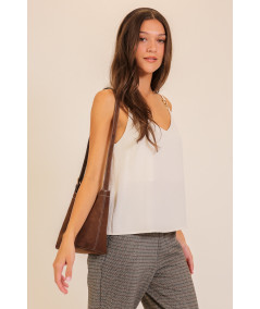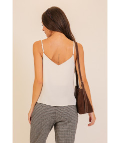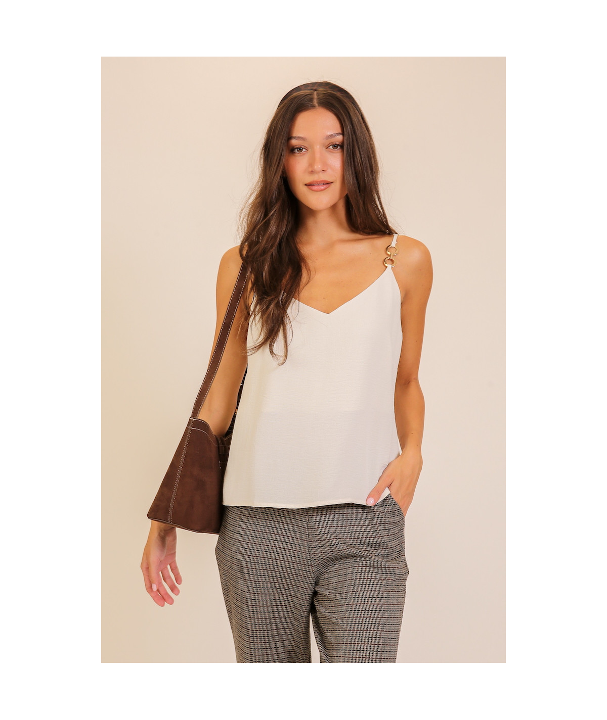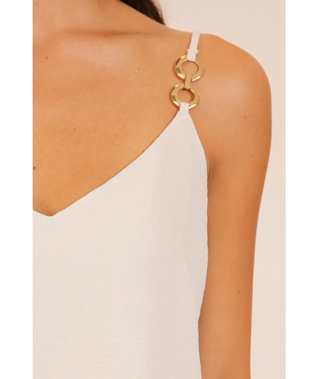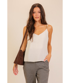 Blusa tipo top para mujer en color blanco con tirantes delgados y detalle de argollas metálicas decorativas en uno de los hombros. Su diseño ligero y de caída suave ofrece un estilo moderno y versátil ideal para combinar con pantalones formales o jeans. Perfecta para looks casuales y elegantes.