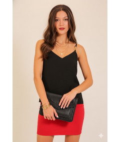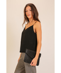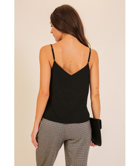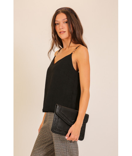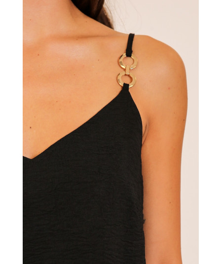 Blusa tipo top para mujer en color negro con tirantes delgados y argollas metálicas decorativas en uno de los hombros. Su diseño moderno y versátil permite crear looks elegantes o casuales. La tela ligera aporta comodidad y una caída favorecedora para distintos estilos y ocasiones.
