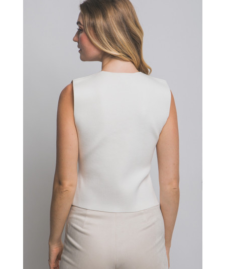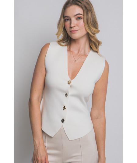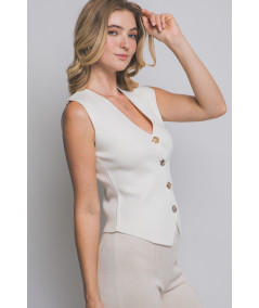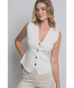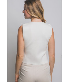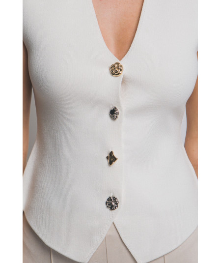 Chaleco para mujer en color crema con diseño sin mangas y escote en V profundo. Presenta corte entallado que estiliza la figura y botones tipo joya en diferentes formas y acabados metálicos, aportando un toque elegante y moderno. Ideal para combinar con pantalones de vestir o jeans en looks de oficina, casual chic o eventos semi formales.