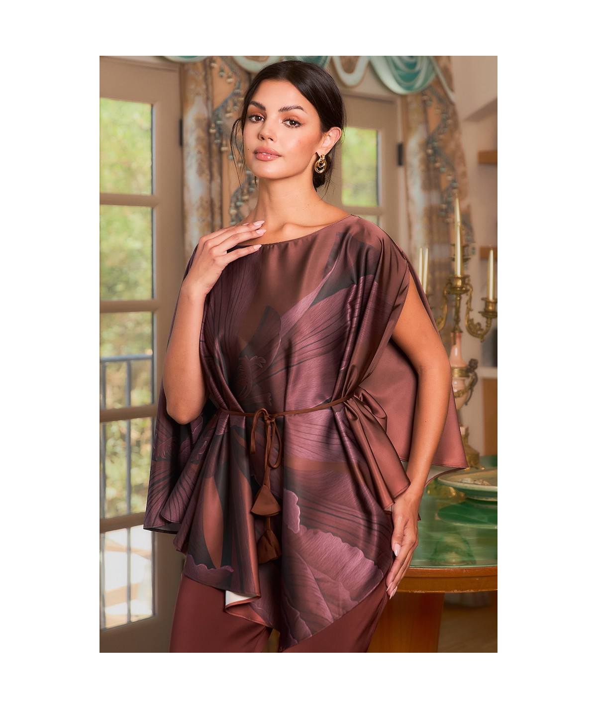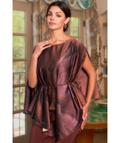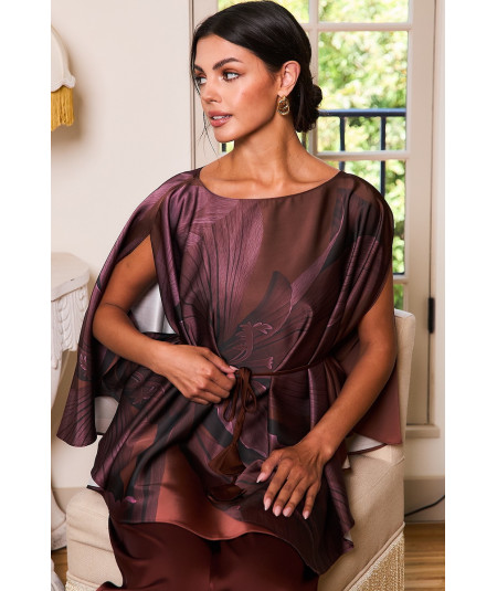 Blusa tipo túnica en seda satinada color café con estampado floral abstracto en tonos marrón y vino. Presenta diseño holgado con caída asimétrica, abertura en los brazos y cinturón ajustable con cordón y borlas que define la cintura. Una prenda elegante y ligera, ideal para eventos de tarde, cenas y looks sofisticados con pantalón de vestir.