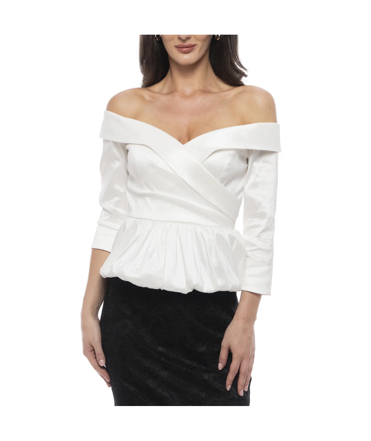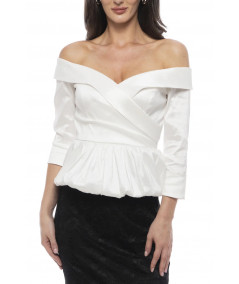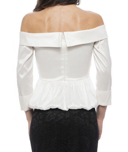 Blusa elegante para mujer en color blanco con diseño off shoulders y escote cruzado tipo corazón. Confeccionada en tela satinada con ligero brillo, cuenta con mangas 3/4 y peplum fruncido que define la cintura y estiliza la silueta. Ideal para combinar con faldas lápiz o pantalones de vestir en eventos formales, cocteles y ocasiones especiales.