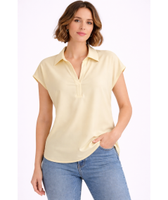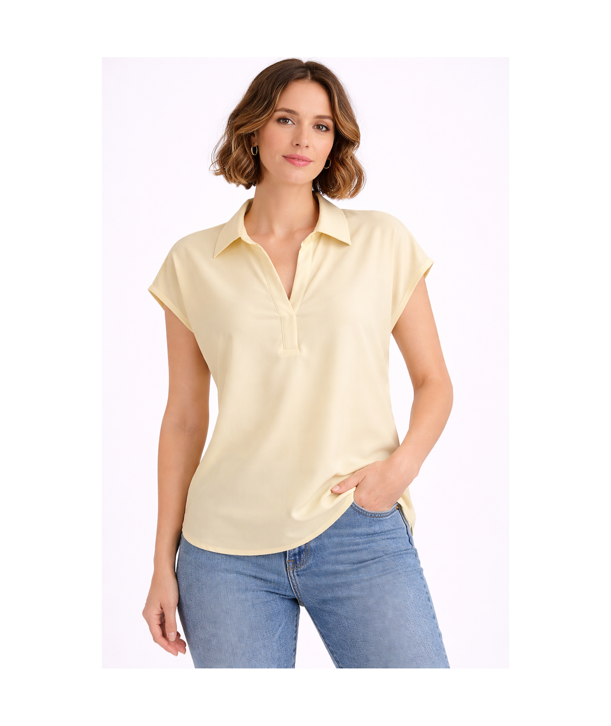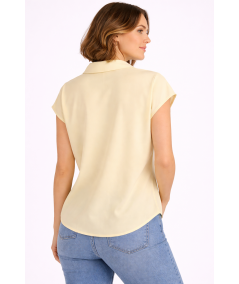 blusa amarilla mujer, blusa manga corta elegante, blusa cuello V mujer, blusa casual elegante, blusa para oficina mujer, blusa básica elegante, blusa moderna femenina, outfit mujer sofisticado, blusa versátil mujer, blusa minimalista mujer