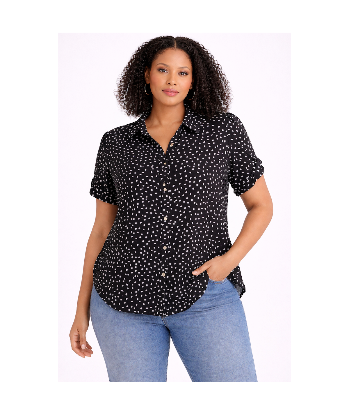 blusa lunares mujer, blusa negra estampada, blusa manga corta elegante, blusa casual elegante mujer, blusa para oficina mujer, blusa moderna femenina, blusa clásica mujer, outfit elegante casual mujer, blusa de moda mujer, blusa versátil mujer