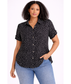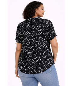 Blusa elegante en color negro con estampado de lunares blancos, manga corta y diseño femenino que aporta un estilo clásico y sofisticado. Ideal para looks casuales elegantes y outfits de oficina.