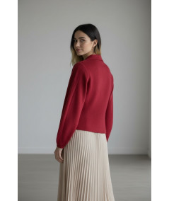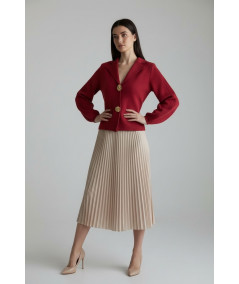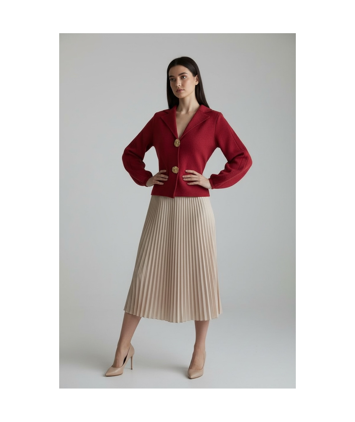 Saco corto en tono vino con textura suave y estructura ligera. Presenta cuello con solapa amplia, manga larga con volumen sutil y dos botones dorados centrales que aportan un toque sofisticado. Su largo a la cadera permite combinarlo con faldas plisadas, pantalones de vestir o jeans, creando conjuntos elegantes para la oficina, reuniones o eventos especiales.