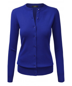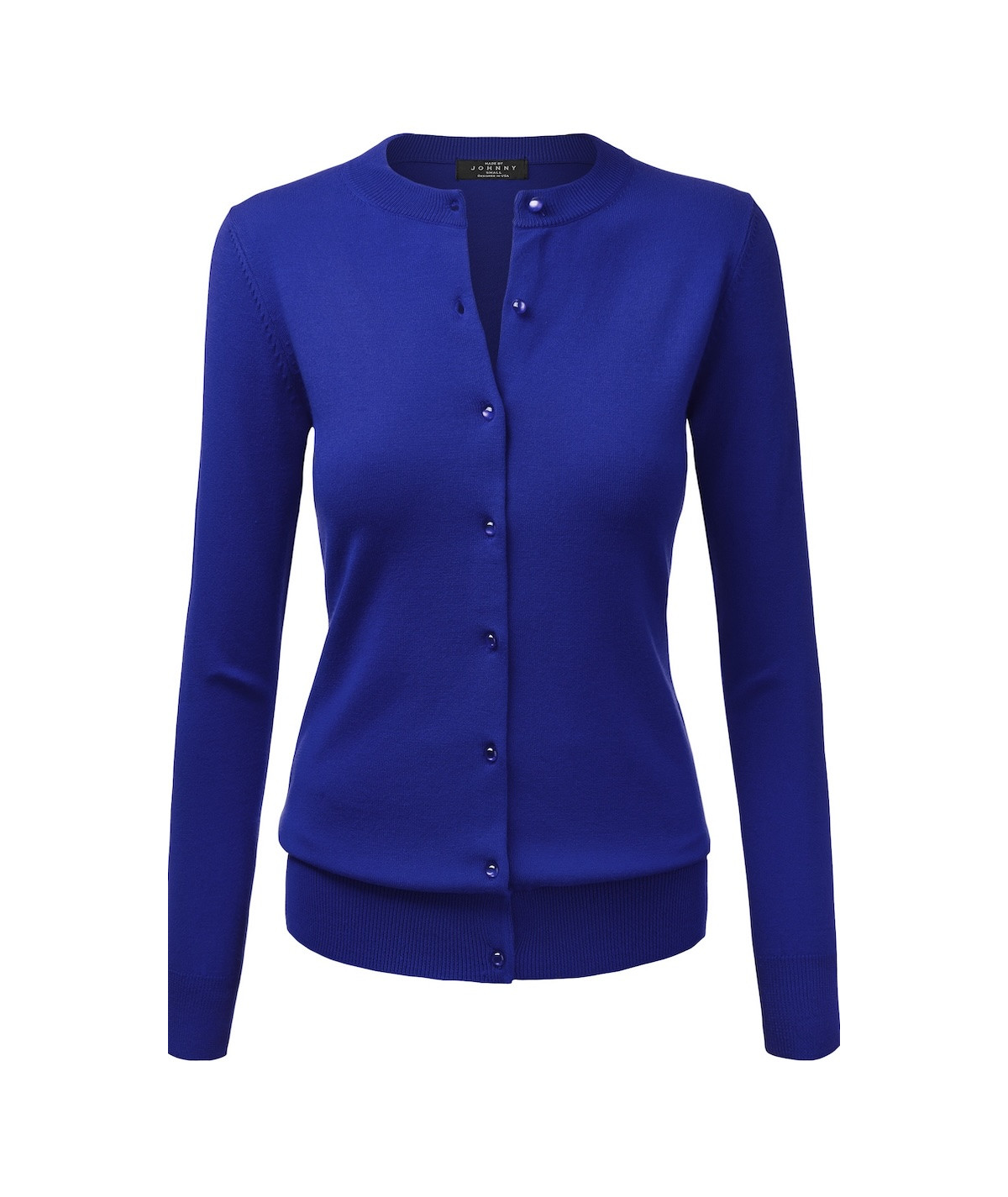 Saco para mujer de tejido fino en color azul rey. Diseño clásico con cuello redondo y cierre frontal de botones al tono. Corte recto que estiliza la silueta. Puños y pretina acanalados para mejor ajuste. Ideal para uso formal o casual de oficina. Prenda versátil, cómoda y fácil de combinar durante todo el año.