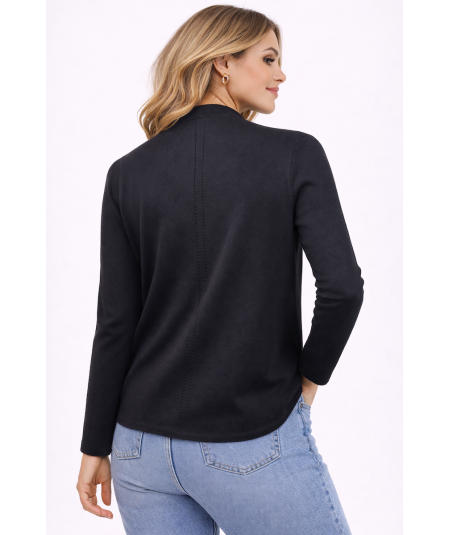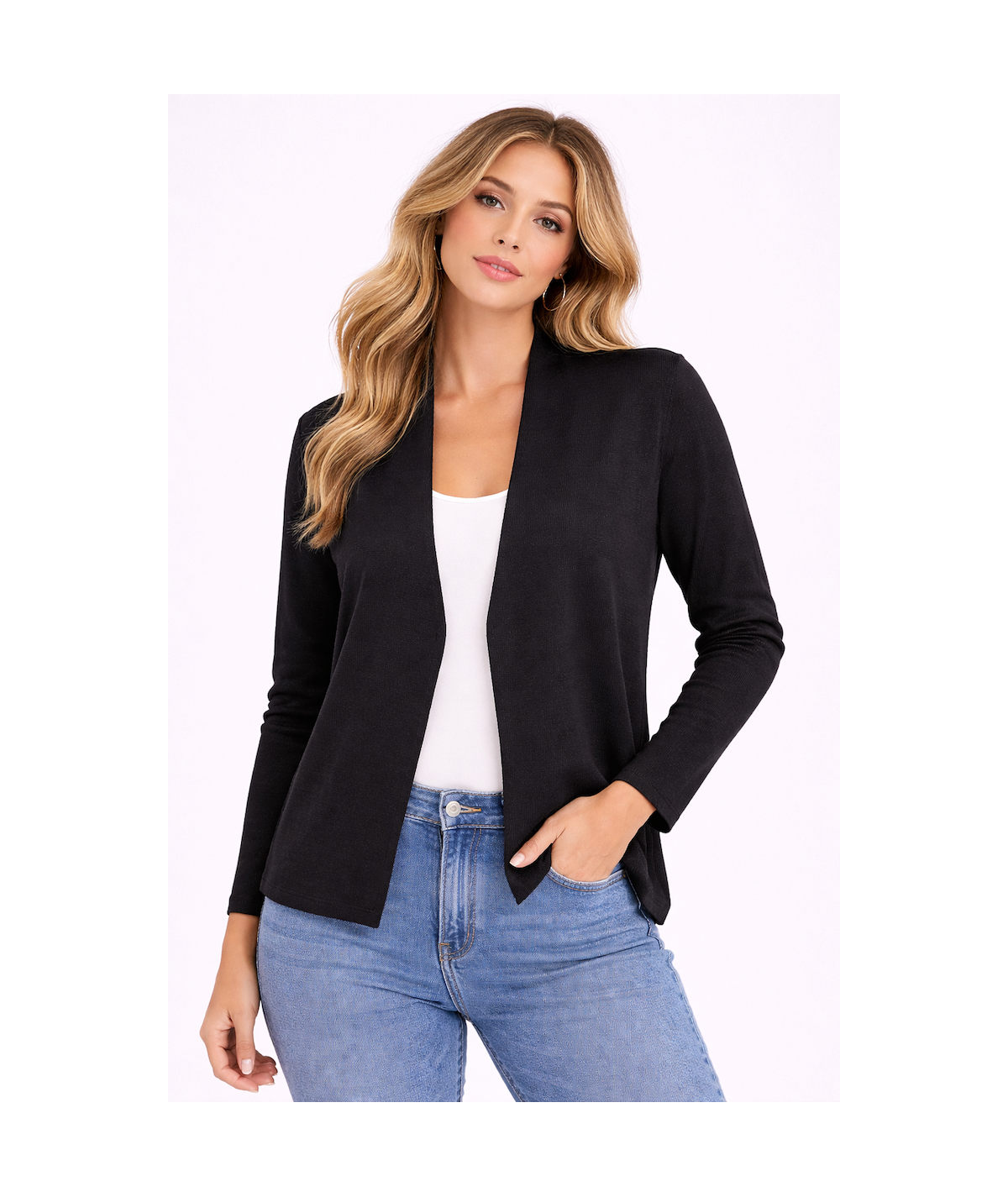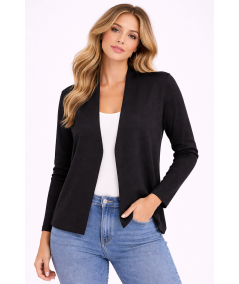 Cardigan elegante en color negro con manga larga y diseño abierto que aporta un estilo moderno, cómodo y sofisticado. Perfecto para complementar looks casuales elegantes o outfits de oficina en cualquier temporada.