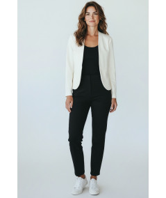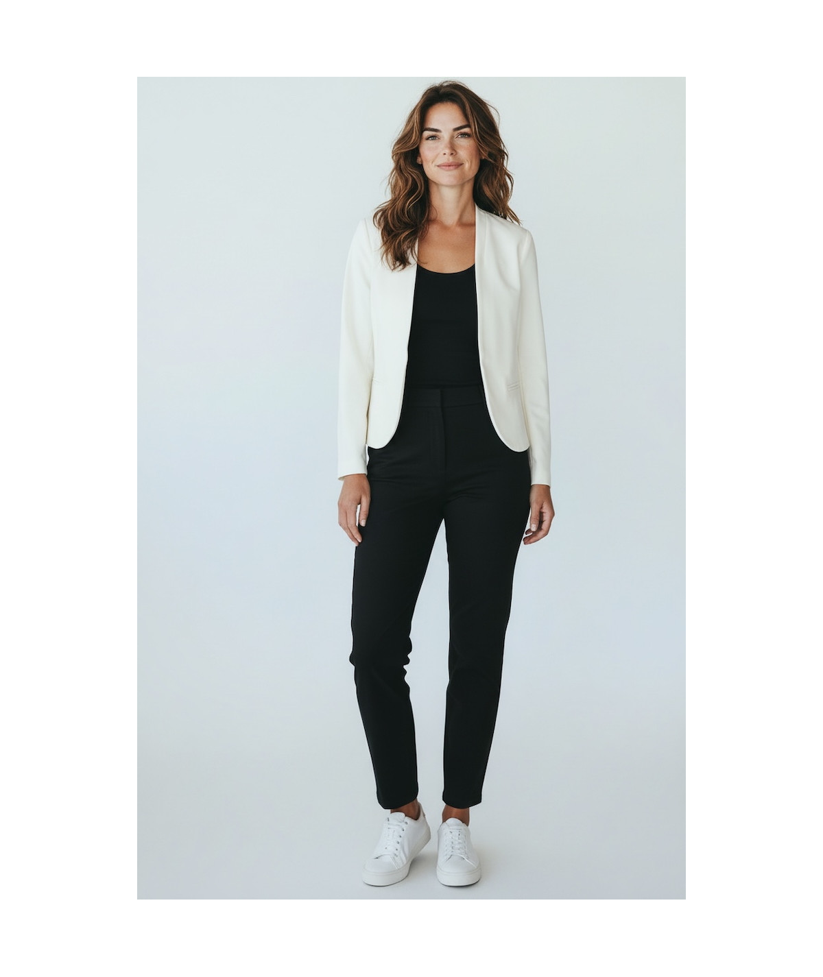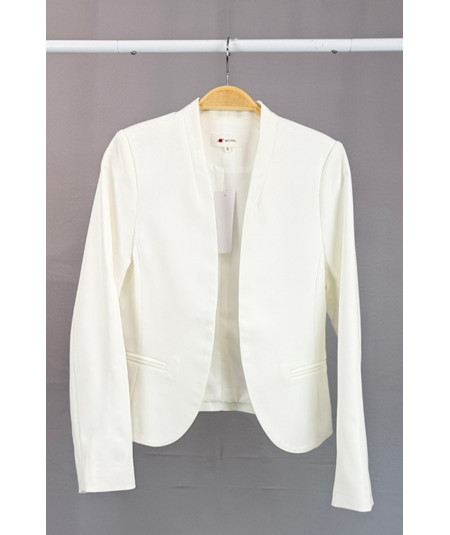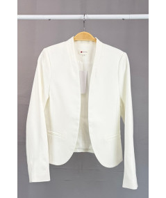 Blazer blanco de corte entallado y diseño minimalista, perfecto para completar looks formales o de oficina. Presenta cuello sin solapa, frente abierto sin botones y bolsillos tipo vivo que estilizan la parte frontal. Su largo a la cadera y las mangas largas crean una silueta limpia y favorecedora, fácilmente combinable con vestidos, pantalones de vestir o jeans para un estilo elegante y versátil durante todo el año.