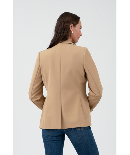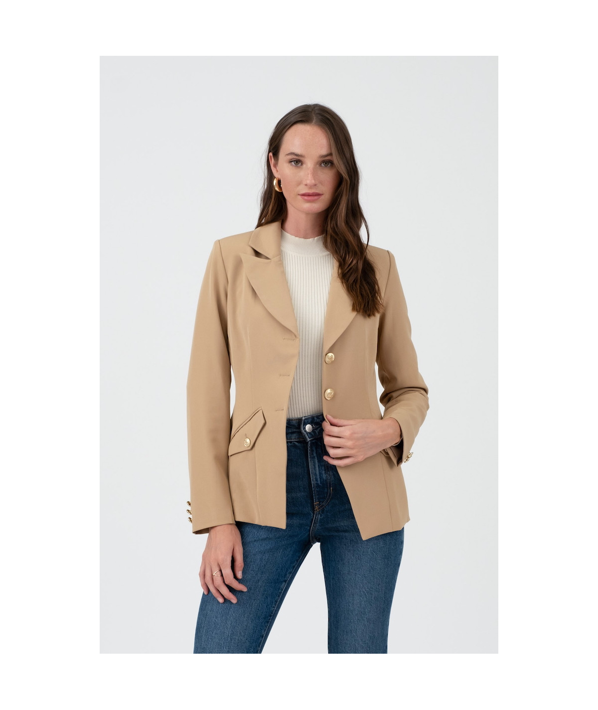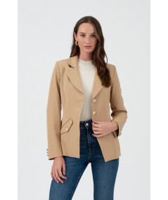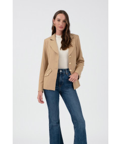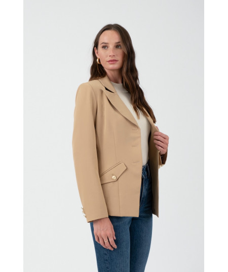 Blazer en color habano de corte entallado, con solapas clásicas y cierre frontal de tres botones dorados que aportan un toque sofisticado. Incorpora bolsillos con tapa y botón decorativo en la parte frontal y detalle de botones dorados en las mangas. Su largo a la cadera y estructura ligera lo convierten en una prenda versátil para combinar con jeans, pantalón de vestir o falda, perfecta para oficina, reuniones y looks casual chic.