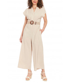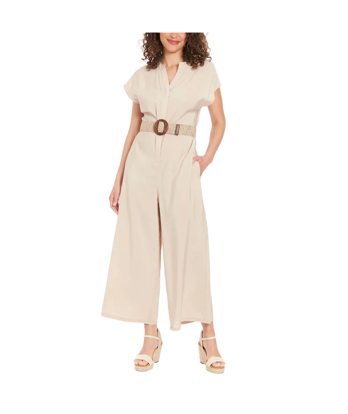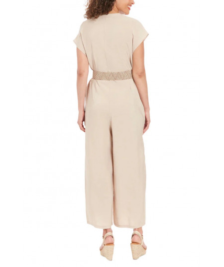 Enterizo para mujer en color beige con diseño relajado y pantalón de pierna ancha tipo culotte. Presenta escote en V discreto, manga corta caída y cinturón trenzado con hebilla circular que define la cintura y aporta un toque natural. Confeccionado en tela ligera y fresca, ideal para días cálidos, looks casuales chic, viajes y salidas de fin de semana.