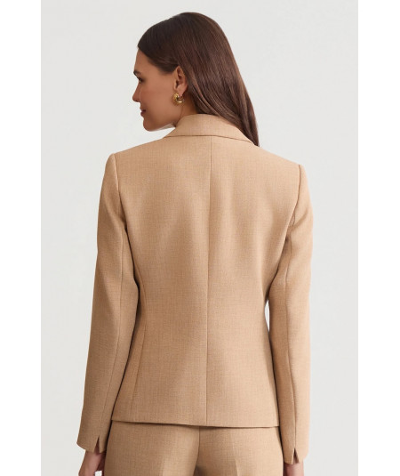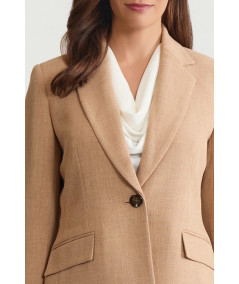 El blazer presenta un corte estructurado con solapa clásica y cierre frontal, que estiliza la figura y aporta un acabado pulido. Su diseño entallado define la cintura, creando una silueta femenina y elegante.