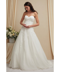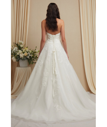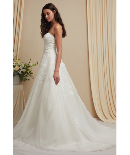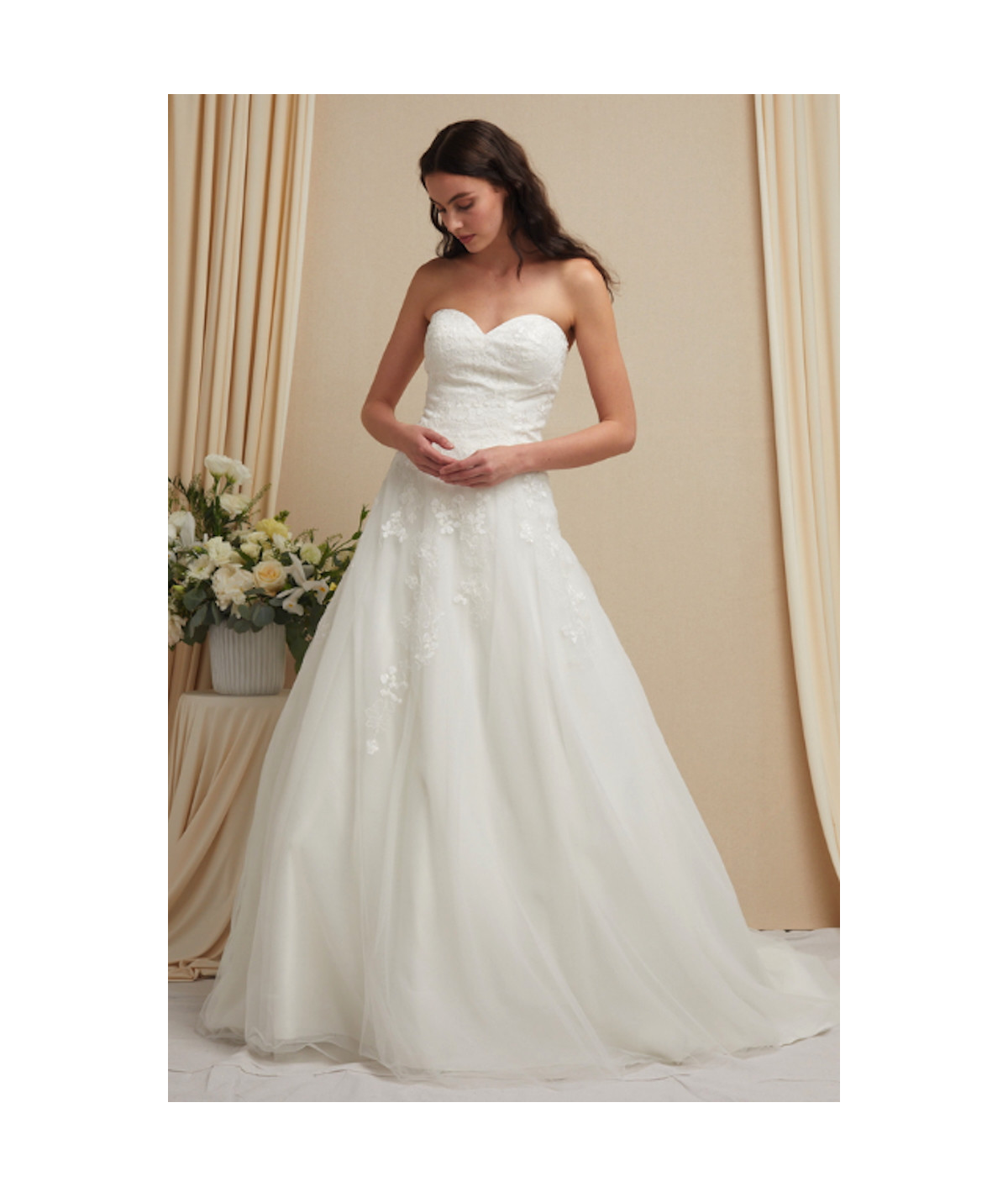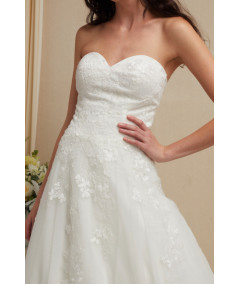 Un diseño atemporal que favorece a distintos tipos de cuerpo gracias a su silueta corte A. El cuerpo strapless con escote corazón aporta feminidad, mientras el tul con encaje floral añade textura y delicadeza. Una opción precisa para novias que buscan elegancia y ligereza en su gran día.