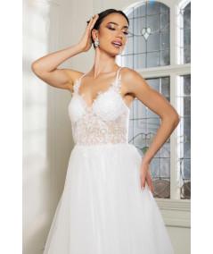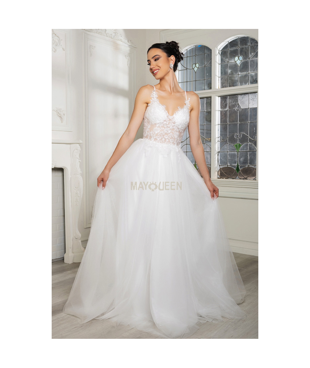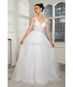 Este vestido de novia de la colección May Queen destaca por su diseño romántico y moderno. El corset con encaje floral transparente resalta la silueta de manera delicada, complementado con tirantes finos y escote en V que aportan un toque sensual y elegante. La falda amplia de tul ofrece un movimiento ligero y etéreo, ideal para ceremonias tanto en interiores como al aire libre. Perfecto para novias que buscan un equilibrio entre feminidad, comodidad y glamour atemporal.