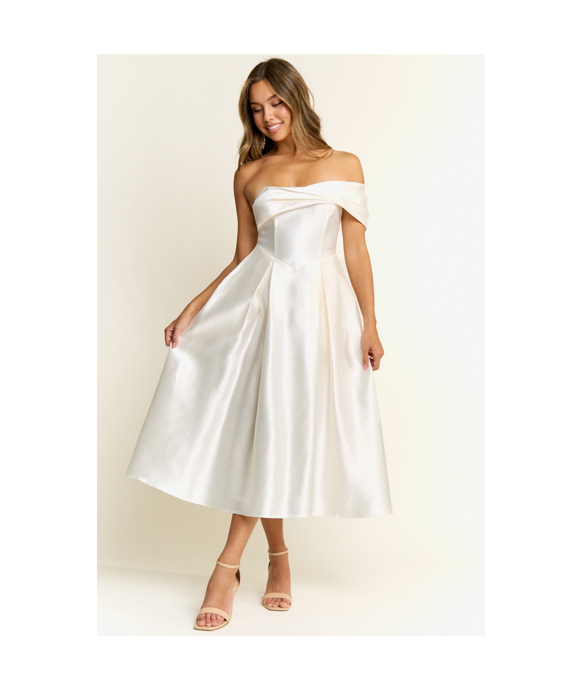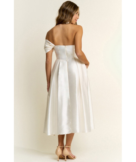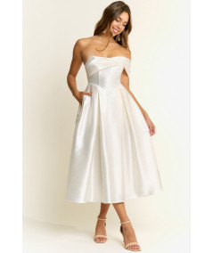 Vestido midi satinado en color perla con un diseño sin tirantes que realza la figura con elegancia. Presenta un escote estructurado con drapeado frontal y corsetería suave que aporta soporte. La falda amplia con pliegues ofrece movimiento fluido y un acabado refinado. Incluye bolsillos laterales funcionales. Ideal para eventos formales, cenas, celebraciones o looks de ocasión.