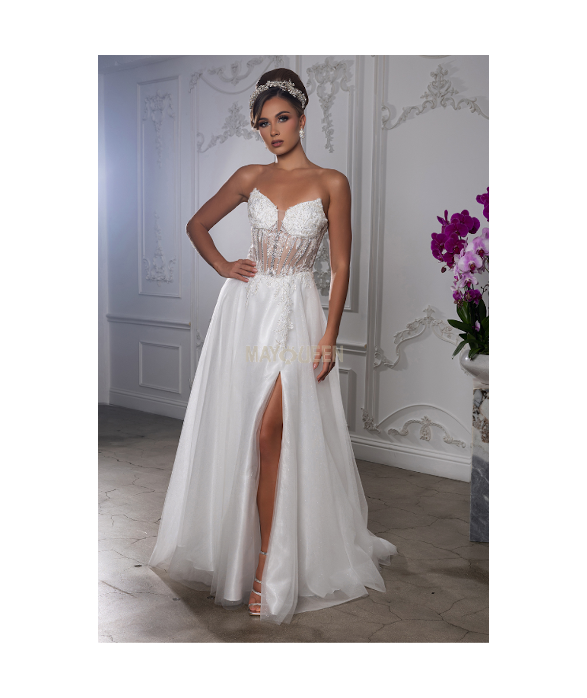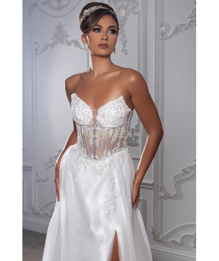 vestido largo de fiesta, vestido blanco elegante, vestido con corset bordado, vestido con pedrería, vestido de gala mujer, vestido con abertura frontal, vestido formal noche