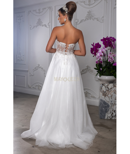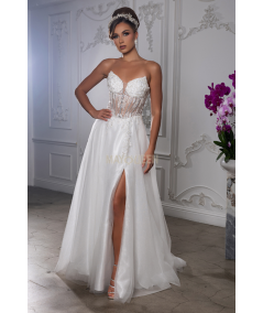 Vestido largo de fiesta en color blanco con escote corazón y corset transparente con delicado bordado y pedrería. Falda amplia de tul con abertura frontal que aporta elegancia y sofisticación, ideal para galas, bodas y graduaciones.