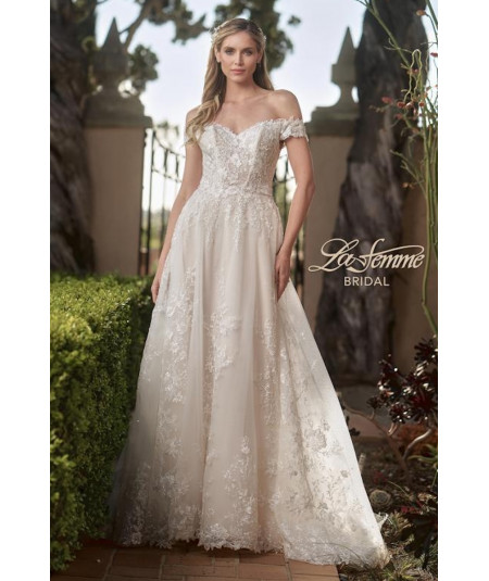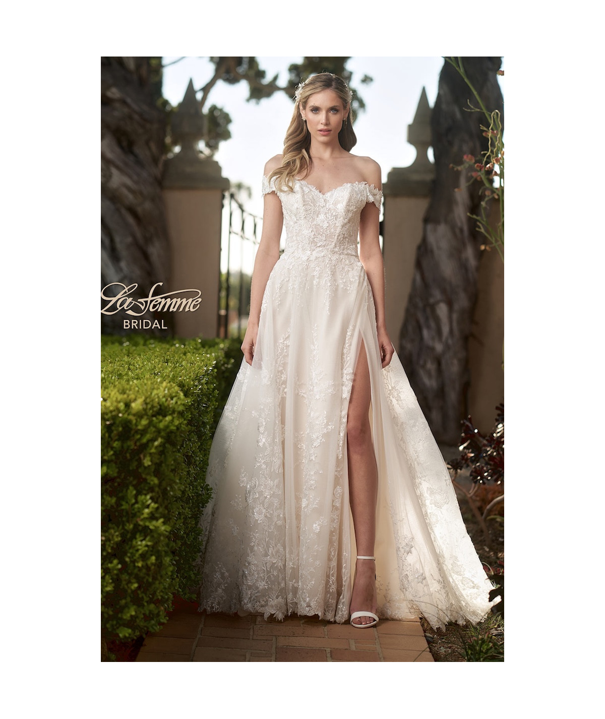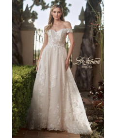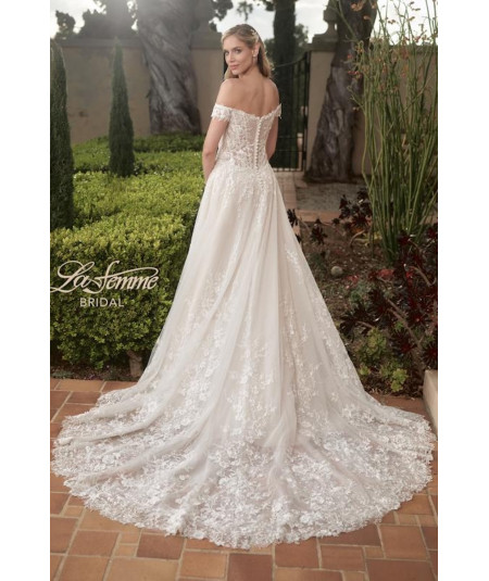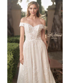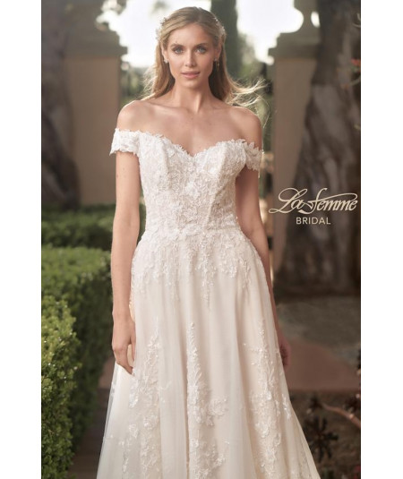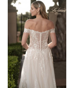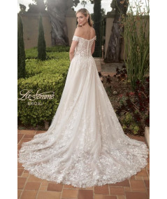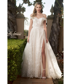 Vestido de novia corte A en tono ivory con delicado encaje bordado y escote corazón off shoulder. Cuerpo estructurado que realza la silueta y falda amplia con abertura lateral y elegante cola con aplicaciones florales. Diseño romántico y sofisticado para una boda inolvidable.