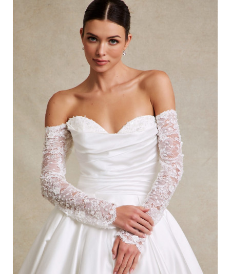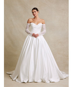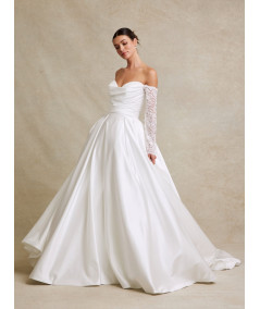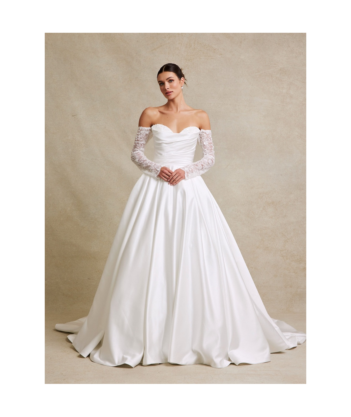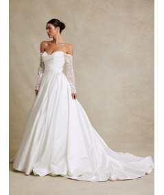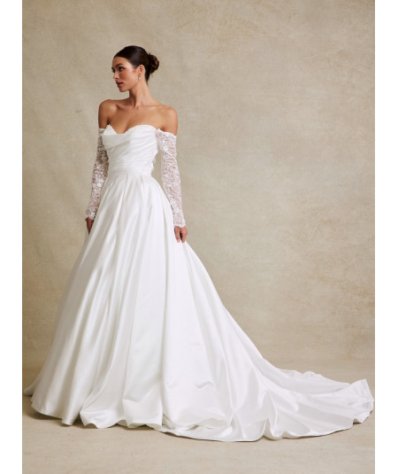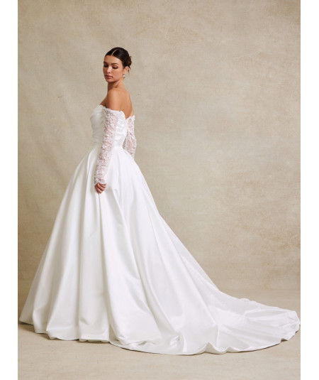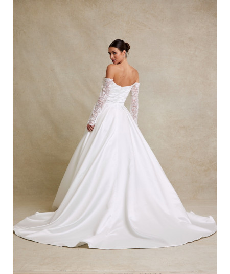 Vestido de novia corte princesa en tono blanco con escote off shoulder y delicadas mangas largas de encaje. Cuerpo estructurado que realza la silueta y falda amplia con elegante cola que aporta un estilo romántico, clásico y sofisticado.