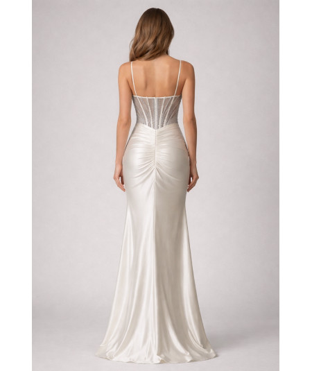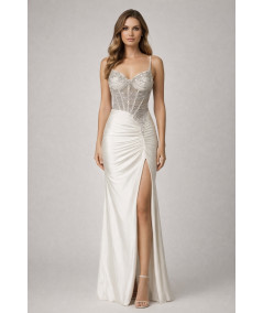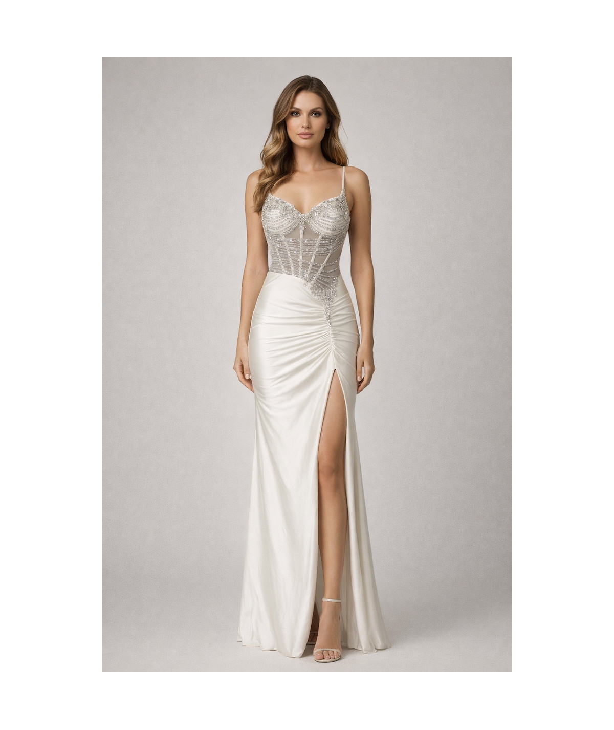 El vestido blanco perla elegante con tirantes finos, corset transparente y pedrería con abertura lateral es una pieza sofisticada que combina sensualidad, elegancia y un diseño moderno ideal para ocasiones especiales. Su silueta ajustada tipo sirena estiliza la figura, creando un look femenino, refinado y de alto impacto.