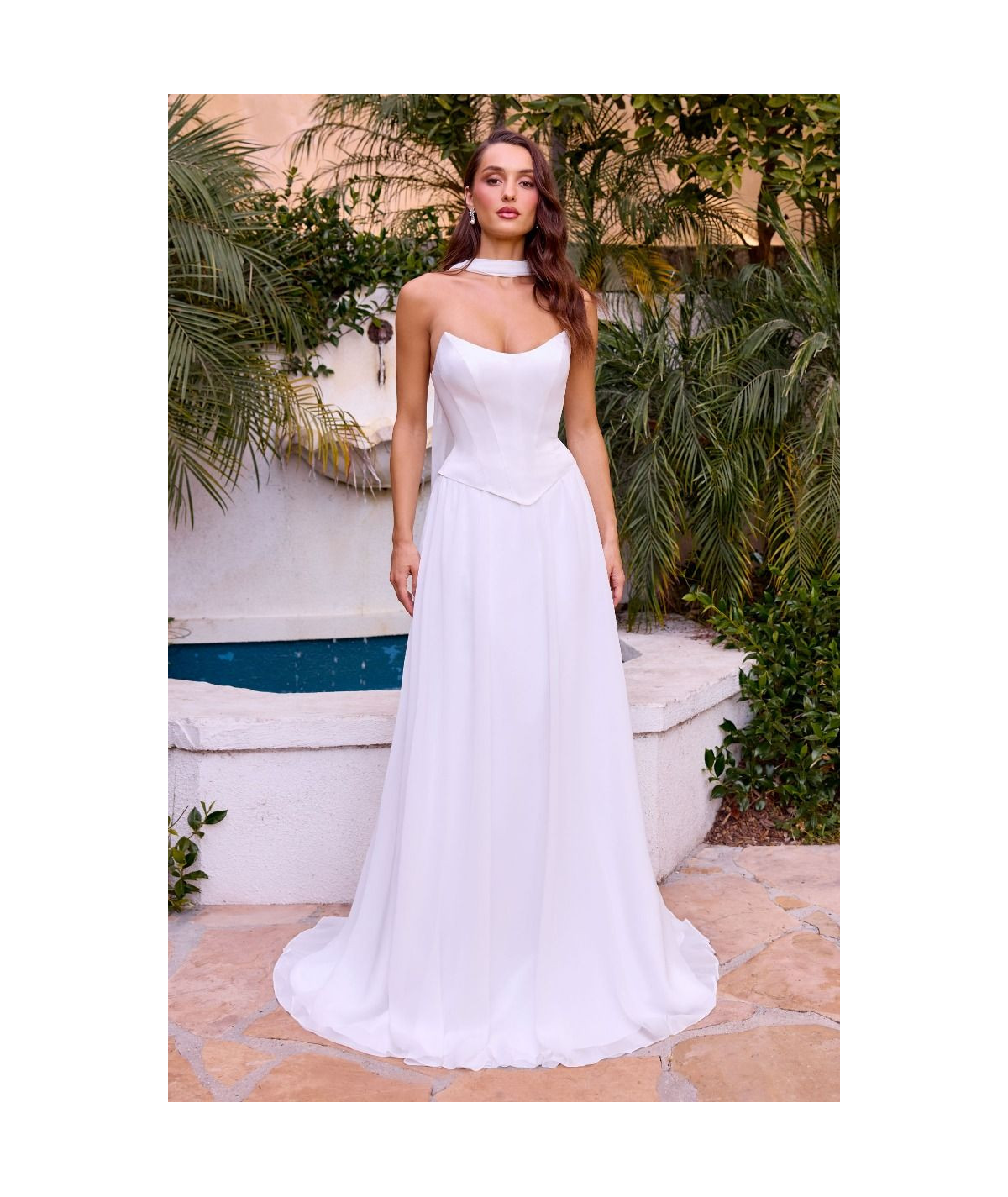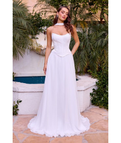 Deslumbra en tu gran día con este hermoso vestido de novia blanco de estilo moderno y refinado. Su corset estructurado realza la figura con un ajuste favorecedor, mientras el detalle de cuello tipo choker aporta un toque contemporáneo y sofisticado. La falda de caída fluida brinda movimiento elegante y comodidad durante toda la celebración. Perfecto para novias que buscan un look minimalista, fresco y memorable.