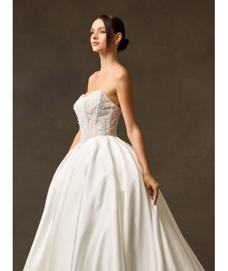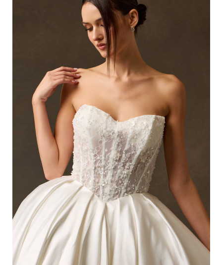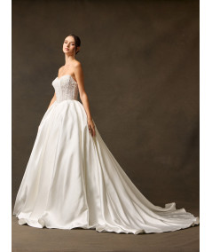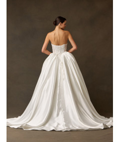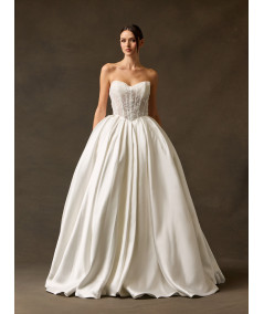 Haz realidad tu sueño con este vestido de novia blanco estilo princesa, corset bordado strapless y falda amplia satinada con cola elegante. Ideal para bodas clásicas, románticas y ceremonias inolvidables.