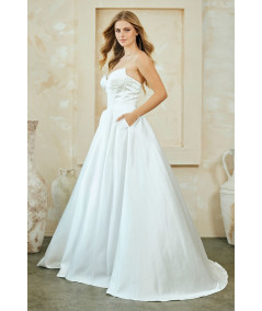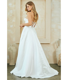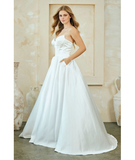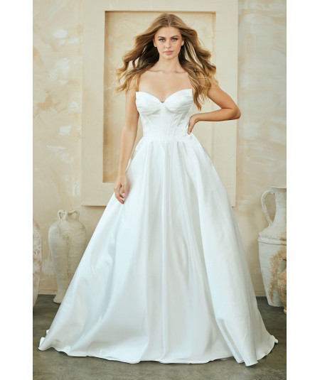 Deslumbra en el día más importante con este hermoso vestido de novia blanco estilo corte A. Su diseño strapless realza hombros y cuello con delicadeza, mientras el corset estructurado estiliza la silueta y brinda un ajuste favorecedor. La espalda ajustable tipo corset aporta comodidad y mejor entalle. Su falda amplia de caída elegante crea movimiento romántico y sofisticado. Perfecto para novias que buscan un look clásico, femenino y atemporal.