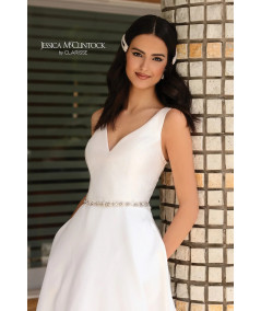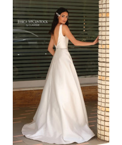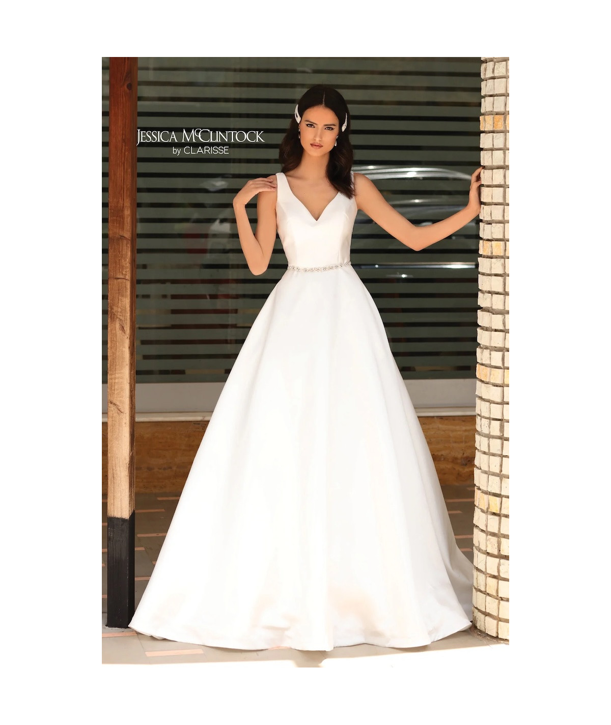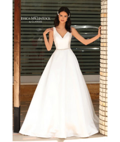 Deslumbra en tu gran día con este sofisticado vestido de novia blanco confeccionado en elegante tela mikado. Su escote en V estiliza el torso mientras la cintura adornada con delicada pedrería resalta la silueta femenina. La falda amplia tipo princesa aporta majestuosidad y movimiento, mientras la espalda descubierta añade un toque moderno y romántico. Ideal para novias que buscan un diseño clásico, refinado y atemporal para una boda inolvidable.