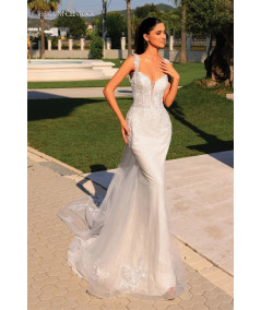 Luce espectacular en tu gran día con este vestido de novia corte sirena diseñado para resaltar la figura con elegancia absoluta. Con delicados bordados de encaje, escote profundo y silueta entallada, este modelo combina sensualidad y romanticismo. Su impresionante cola removible añade dramatismo y sofisticación para la ceremonia, permitiéndote transformarlo fácilmente para la recepción. Ideal para novias modernas que buscan un look impactante, refinado e inolvidable.