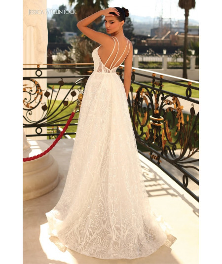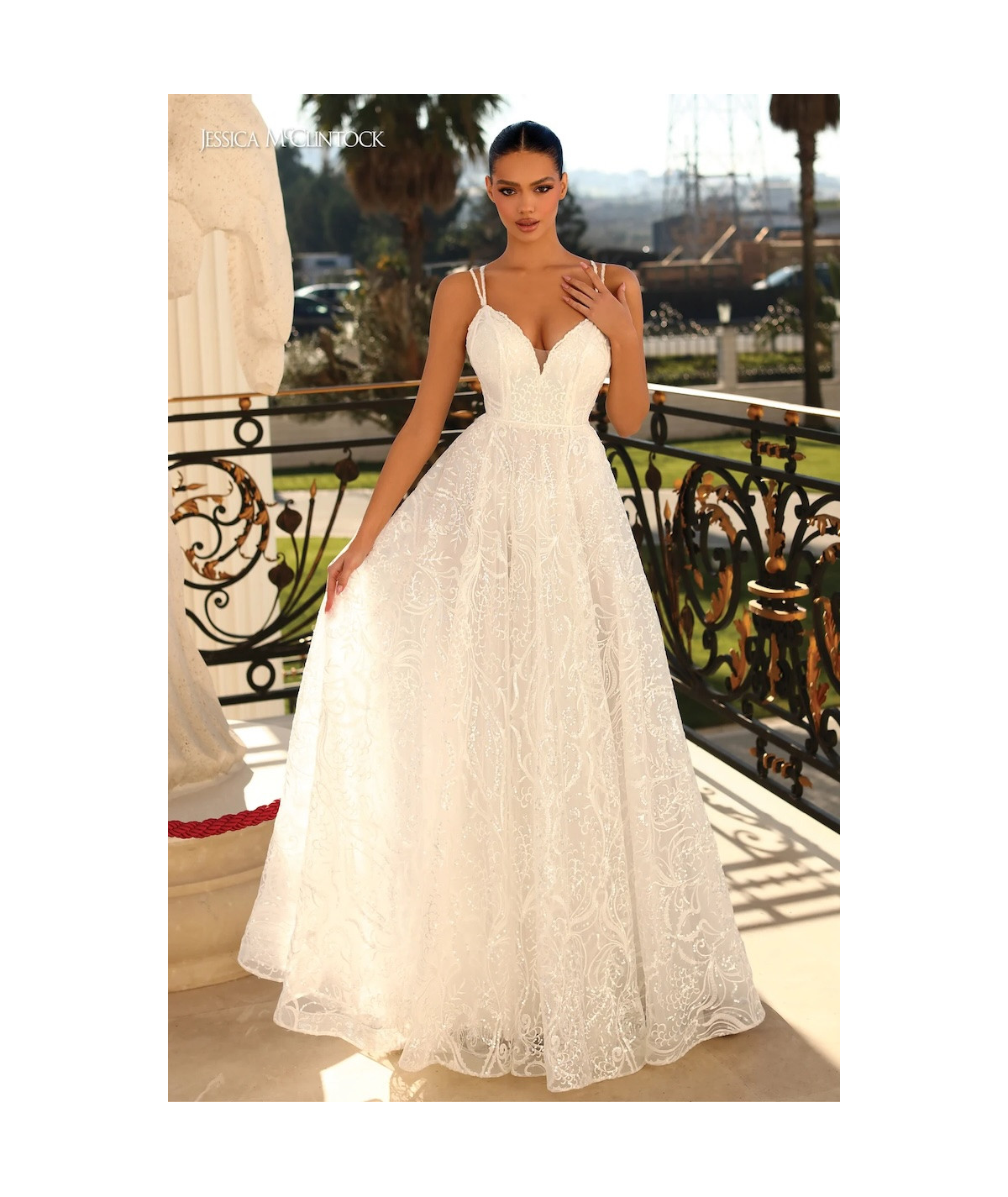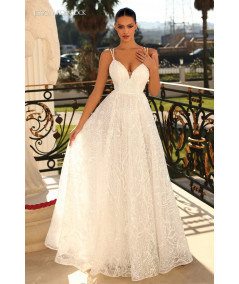 Deslumbra en tu gran día con este vestido de novia corte A diseñado para realzar la figura con elegancia y delicadeza. Su escote profundo aporta un toque sofisticado, mientras el fino bordado brillante cubre todo el diseño con detalles románticos. La espalda descubierta con tirantes finos añade modernidad y sensualidad sutil. Su falda amplia brinda movimiento y comodidad, convirtiéndolo en la elección perfecta para novias que buscan un look femenino, refinado e inolvidable.