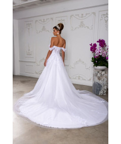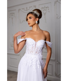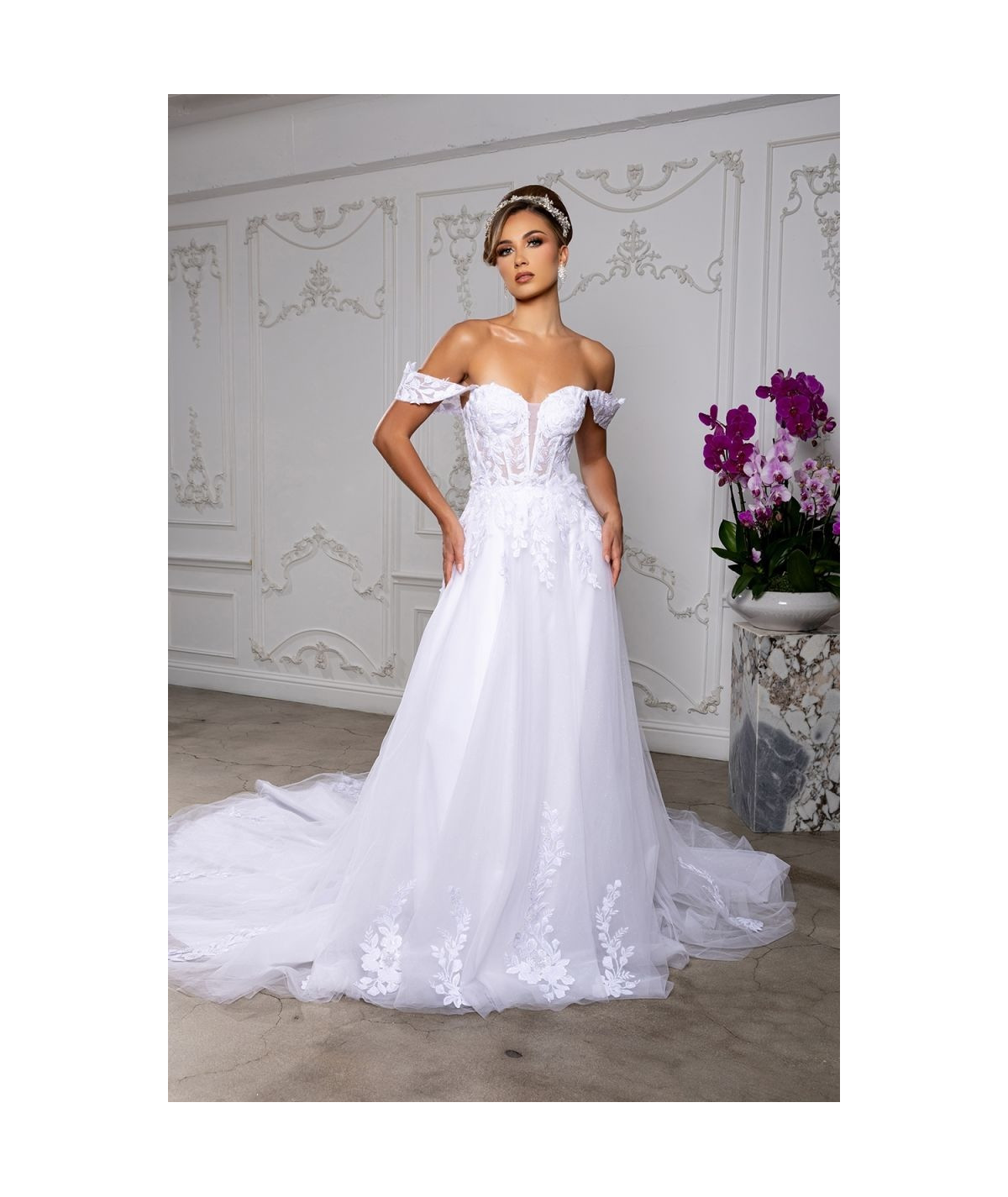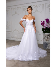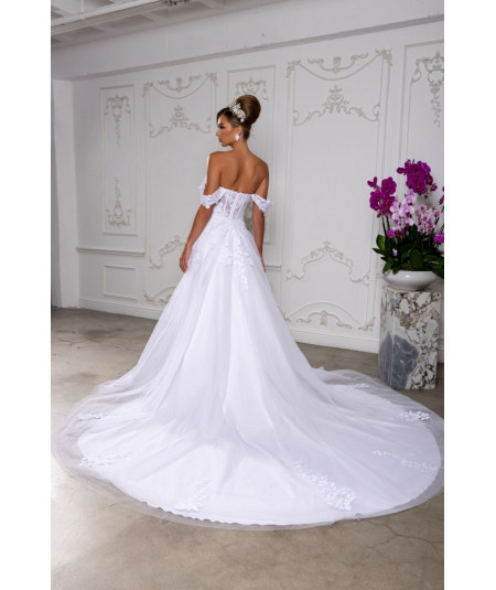 Luce espectacular en tu gran día con este vestido de novia blanco de inspiración romántica. Su diseño off shoulders resalta delicadamente los hombros y el escote, mientras el corset estructurado con aplicaciones de encaje floral define la silueta con elegancia. La falda amplia de tul con cola larga aporta movimiento, volumen y presencia majestuosa. Ideal para novias que buscan un estilo princesa moderno, sofisticado e inolvidable para su ceremonia.
