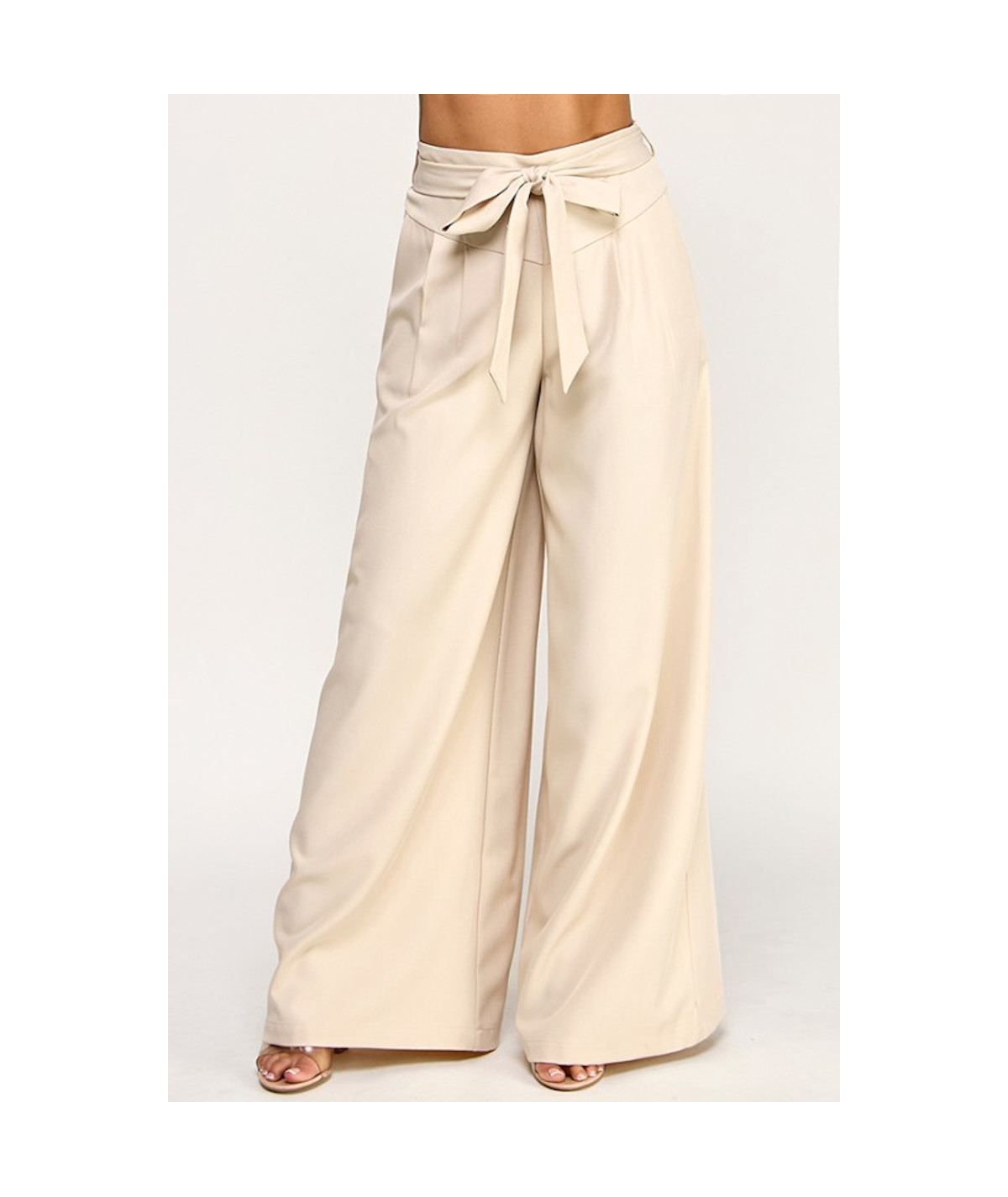 Pantalón palazzo en color beige de tiro alto, diseñado para estilizar la figura y aportar máxima comodidad. Incorpora una pretina ancha con lazo delantero para ajustar a la cintura y pliegues suaves que dan caída fluida a la pierna. El corte amplio y largo crea un movimiento elegante al caminar, ideal para combinar con blusas, tops o bodys en looks de oficina, eventos de día o conjuntos casual chic. Una prenda versátil y sofisticada para cualquier guardarropa.