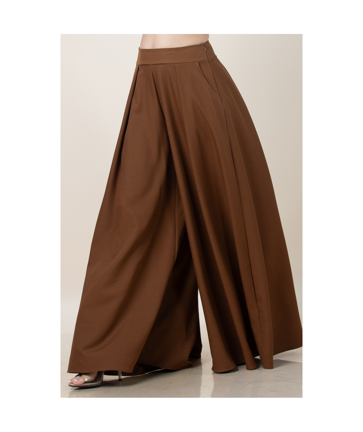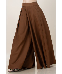 Pantalón palazzo color chocolate con un diseño de pierna extra ancha que ofrece caída fluida y movimiento natural. Incluye cintura alta estructurada, pinzas frontales y acabado suave que aporta un estilo sofisticado. Versátil para combinar con blusas, tops o prendas formales. Ideal para look diario o eventos.