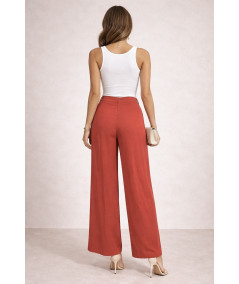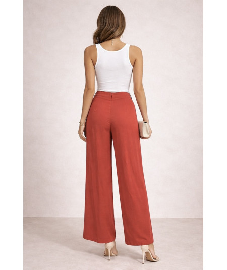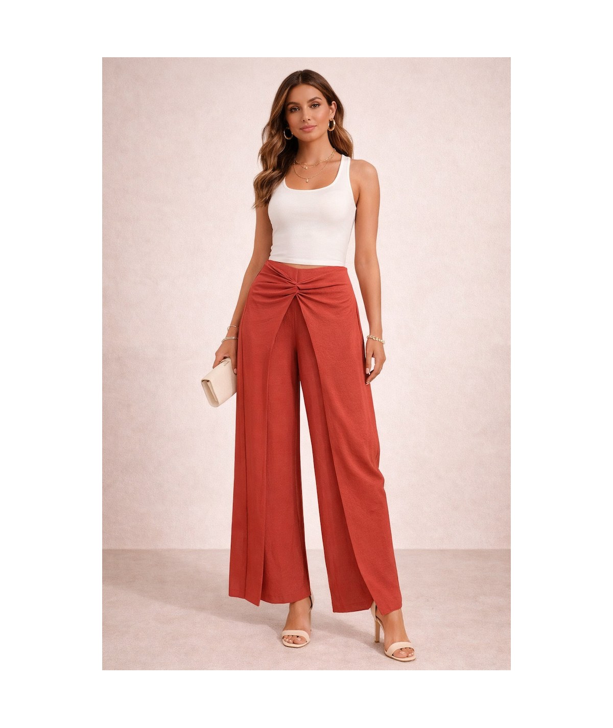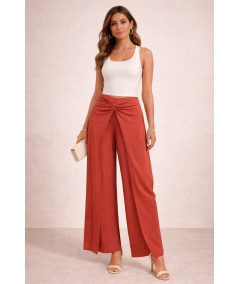 Pantalón palazzo terracota para mujer con diseño elegante y moderno. Destaca por su detalle frontal tipo nudo o drapeado en la cintura que aporta un toque sofisticado y estiliza la silueta. Confeccionado en un tejido ligero y de excelente caída que brinda comodidad y libertad de movimiento. Su corte amplio tipo palazzo crea un look fluido y refinado, ideal para ocasiones especiales, eventos, salidas elegantes o outfits casuales chic. Su color terracota añade un estilo cálido y contemporáneo que combina fácilmente con blusas, tops o prendas formales.