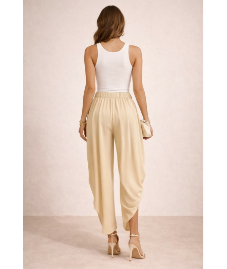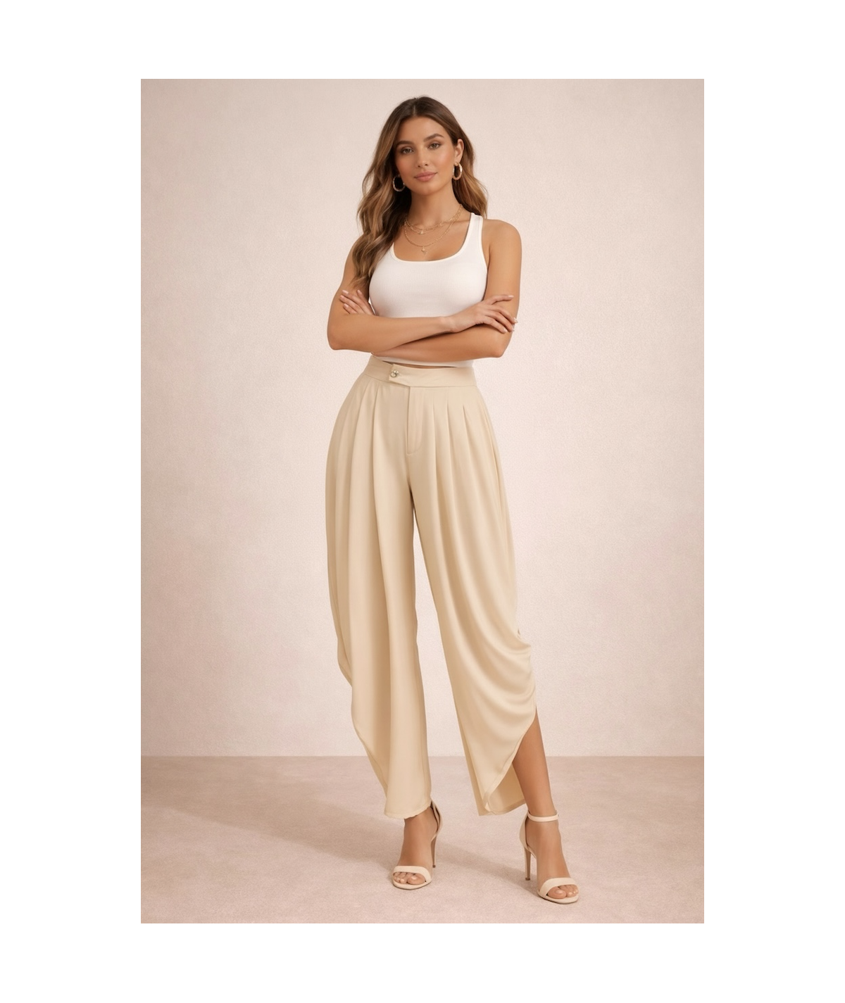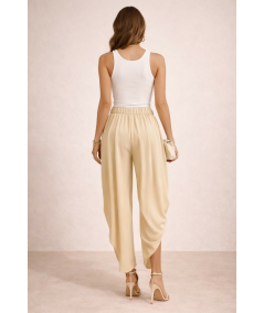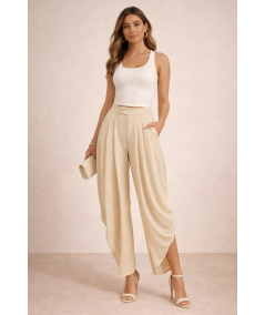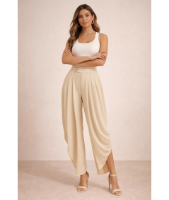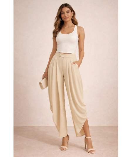 Pantalón palazzo beige para mujer con diseño elegante y sofisticado. Presenta cintura alta con delicados pliegues frontales que aportan volumen y movimiento, creando una silueta estilizada y femenina. Confeccionado en un tejido ligero y fluido que brinda comodidad durante todo el día. Su corte amplio tipo palazzo ofrece un look moderno y refinado, ideal para outfits de oficina, eventos formales o combinaciones casuales elegantes. El tono beige neutro permite múltiples combinaciones con blusas, tops o blazers para lograr un estilo versátil y atemporal.