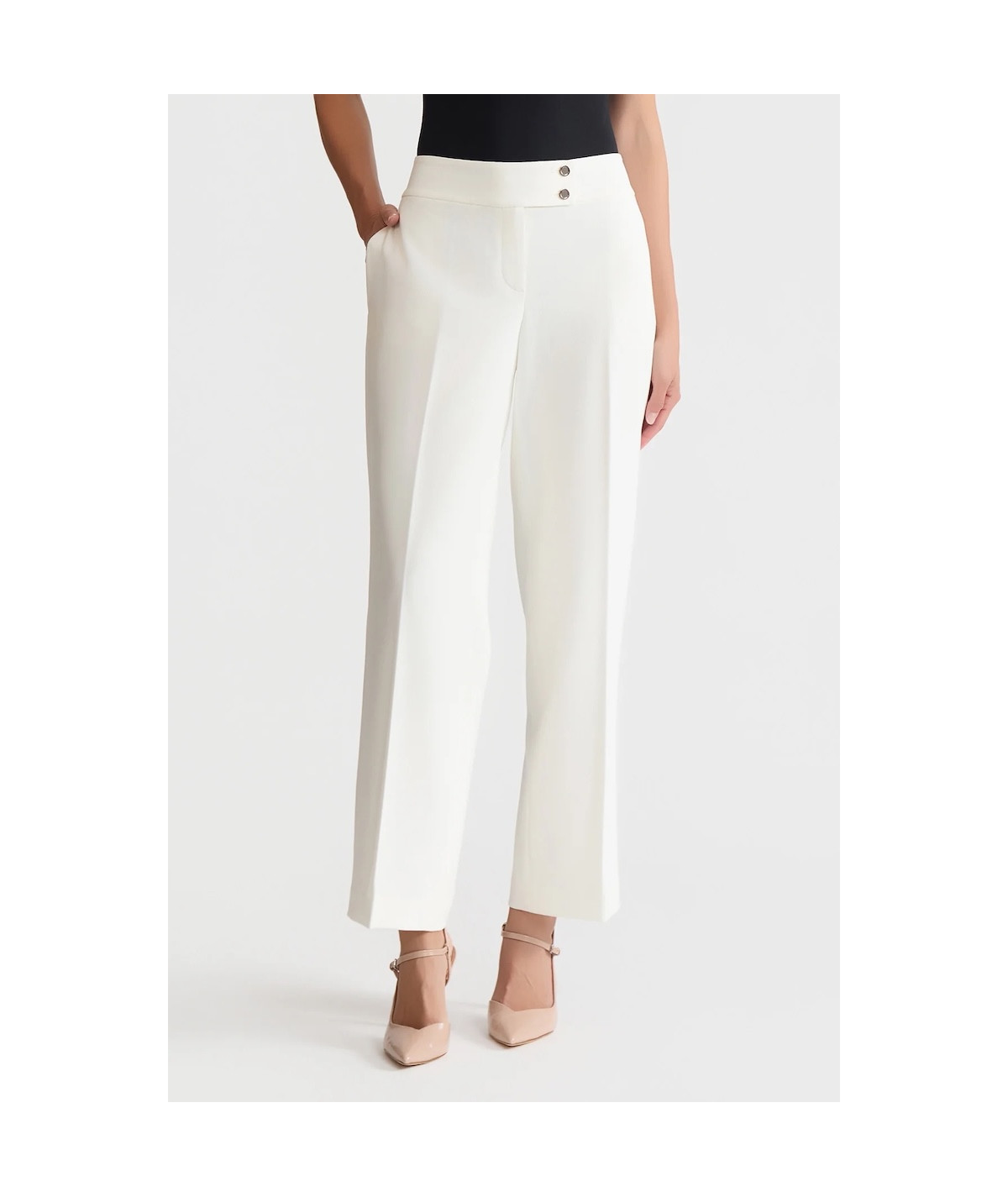 Su diseño incorpora un tiro alto con pretina estructurada y botones decorativos, que estiliza la cintura y aporta un toque distintivo. El corte recto con caída fluida alarga visualmente la silueta, brindando un ajuste favorecedor y elegante.