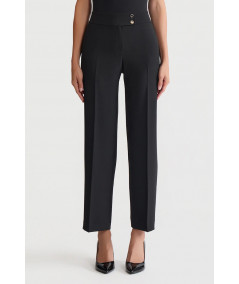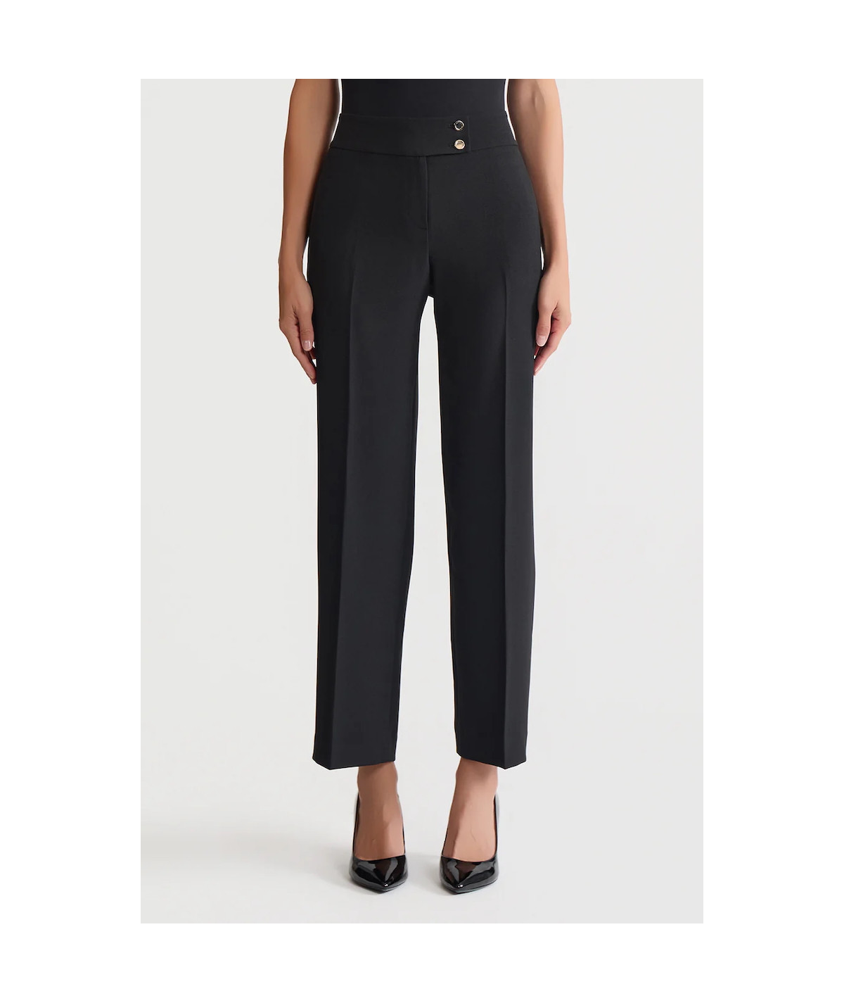 Su diseño incorpora un tiro alto con pretina estructurada y botones decorativos, que estiliza la cintura y aporta un acabado refinado. El corte recto crea una línea limpia y alarga visualmente la silueta, brindando un ajuste favorecedor y elegante.