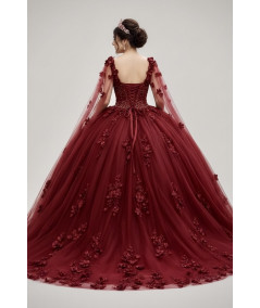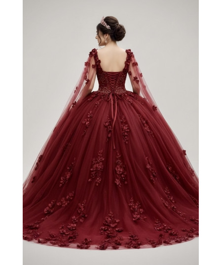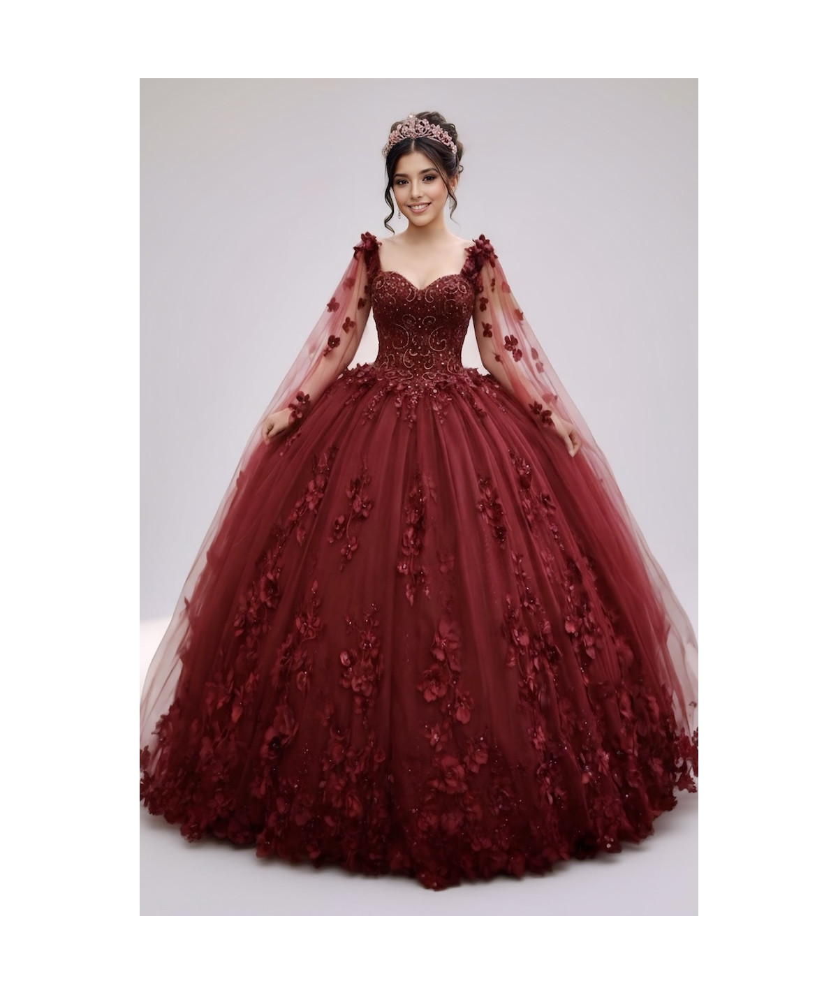 vestido largo de gala, vestido burgundy elegante, vestido vino princesa, vestido con flores bordadas, vestido de quinceañera lujo, vestido de fiesta elegante, vestido formal de alta costura