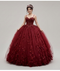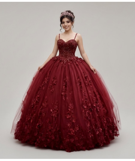 Vestido largo de gala en color vino/burgundy con diseño tipo princesa, cuerpo completamente bordado con pedrería y delicadas aplicaciones florales en relieve. Falda amplia de tul con detalles florales y acabado de lujo, ideal para quinceañeras, galas y eventos de alto impacto.
