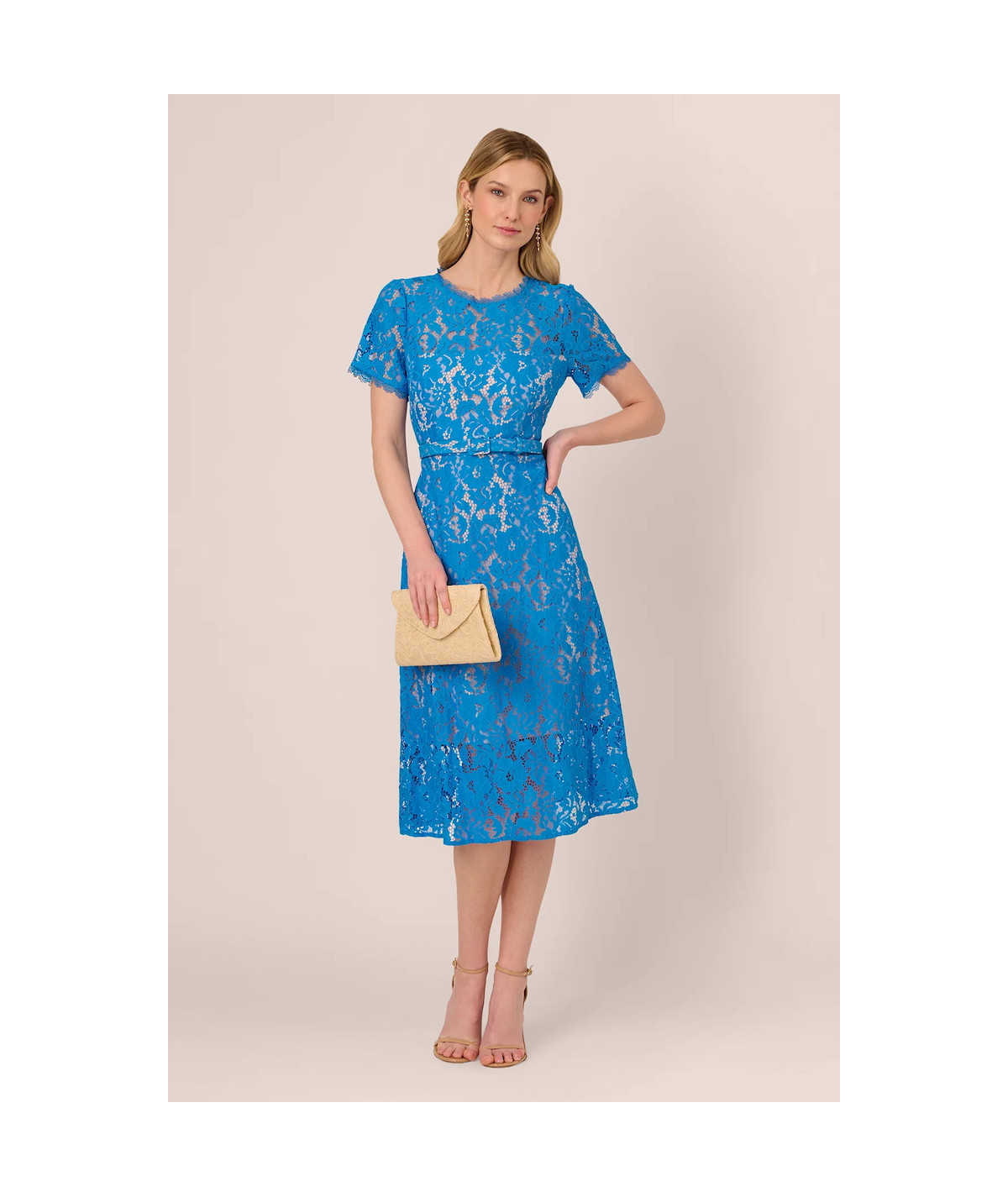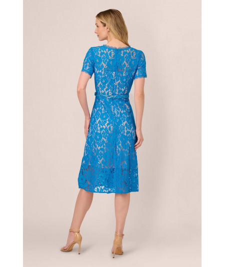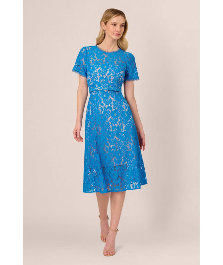 Resalta tu estilo con este vestido Adrianna Papell de encaje en color azul celeste, un diseño midi que combina delicadeza y sofisticación. Con mangas cortas, cuello redondo y un favorecedor corte en A, este vestido es ideal para bodas, cócteles, cenas elegantes y eventos formales. Su acabado en encaje floral añade un toque romántico y exclusivo, perfecto para destacar en cualquier ocasión especial.