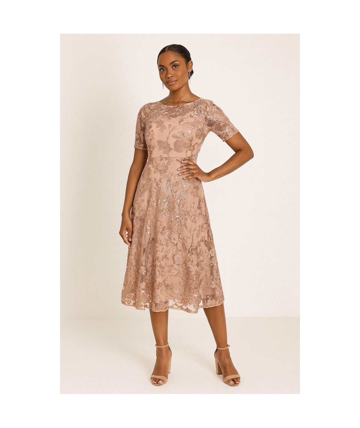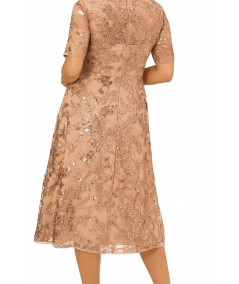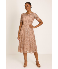 Su corte midi y falda de vuelo ligera ofrecen un movimiento elegante, mientras que las mangas cortas y el escote redondeado aportan comodidad y discreción sin perder glamour.