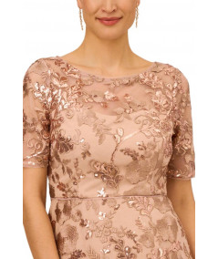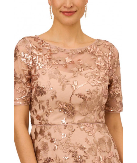 Este vestido Adrianna Papell midi dorado con bordado floral es sinónimo de sofisticación y estilo. Diseñado con una base en tono nude-dorado, está adornado con bordados delicados y detalles de lentejuelas brillantes que aportan un acabado luminoso y refinado.