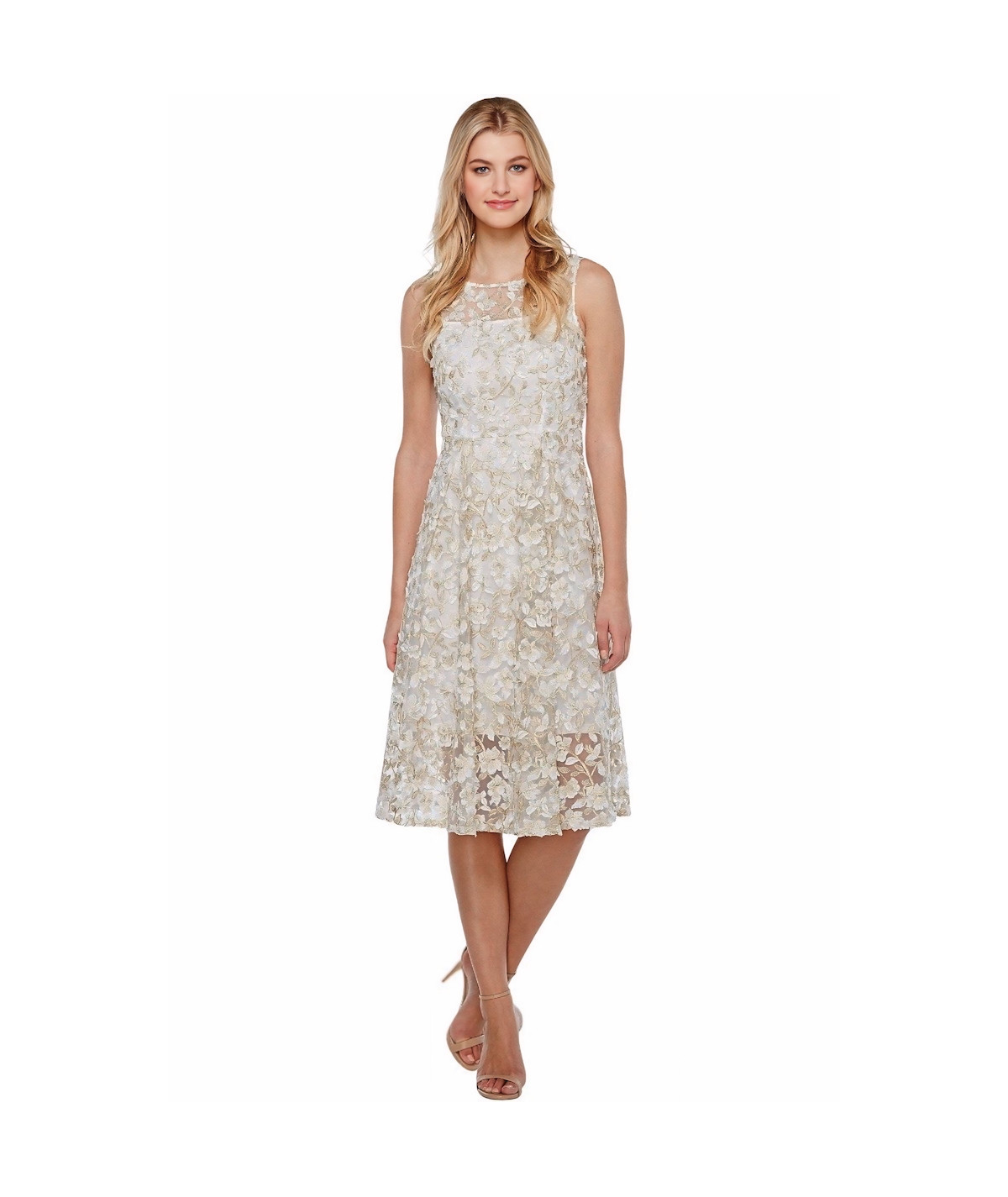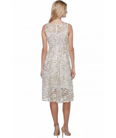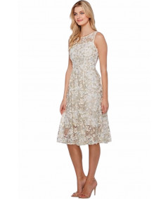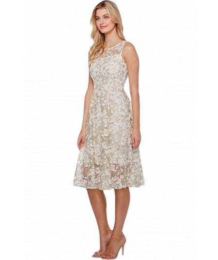 Este vestido Adrianna Papell en encaje marfil con flores 3D es una pieza única que combina elegancia y detalles artesanales. El diseño cuenta con un escote ilusión con transparencias delicadas, corte sin mangas y una falda midi de vuelo ligero que aporta movimiento y frescura.