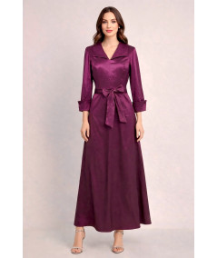 Este vestido largo de fiesta color burdeos combina elegancia clásica y comodidad moderna. Confeccionado en tafetán satinado que aporta un sutil brillo, cuenta con un cuello camisero sofisticado, mangas 3/4 con puños estructurados y un cinturón a la cintura que realza la silueta femenina. Su caída fluida y ligera lo convierten en una prenda perfecta para bodas, cenas de gala, cocteles o eventos formales.