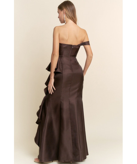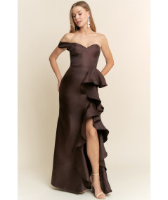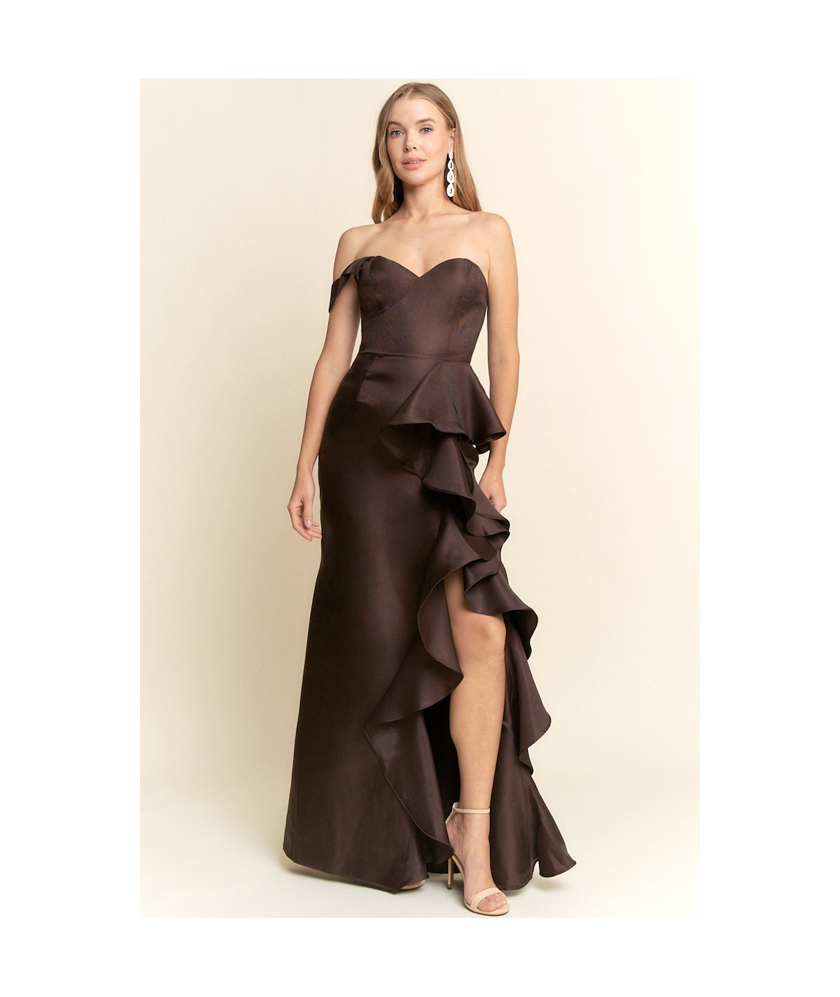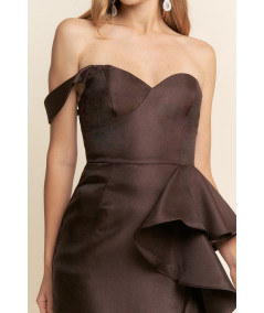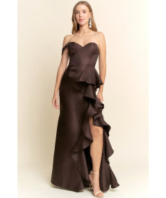 Diseño contemporáneo que favorece la silueta con un cuerpo ajustado y escote corazón. El volante asimétrico genera movimiento y la abertura lateral aporta un toque moderno. El acabado satinado intensifica el color chocolate y eleva el look para para el día o la noche.