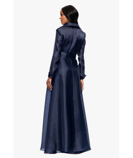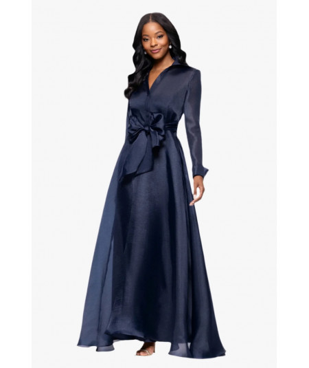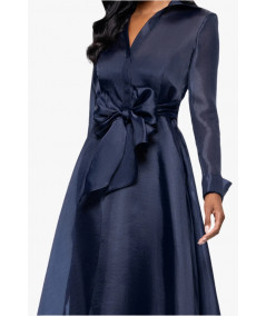 Elegancia estructurada en organza azul marino. Este Betsy & Adam incorpora cuello camisero con escote en V, mangas largas y un lazo voluminoso que define la cintura. La falda amplia ofrece movimiento y ligereza, perfecta para galas, bodas de noche o madrinas. Acabado sofisticado que favorece distintas siluetas.