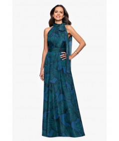 Este Betsy & Adam combina sofisticación y movimiento. Con cuello halter adornado por un lazo largo lateral, cintura definida y estampado floral en tonos azul petróleo. La falda larga y fluida aporta elegancia en cada paso. Tejido ligero con brillo sutil y forro para mayor comodidad. Perfecto para bodas de noche, galas o madrinas.