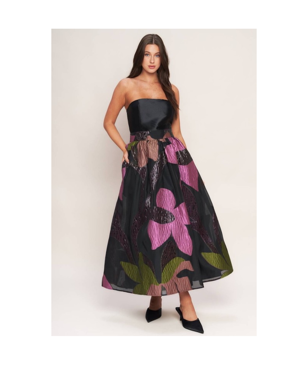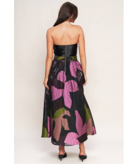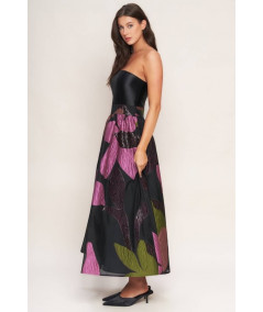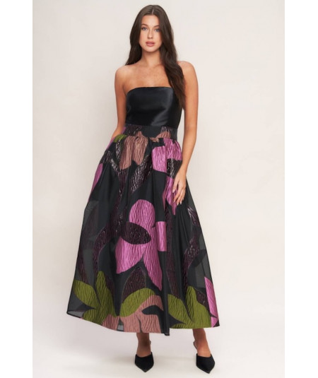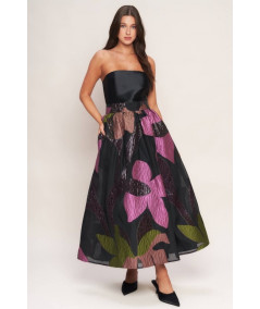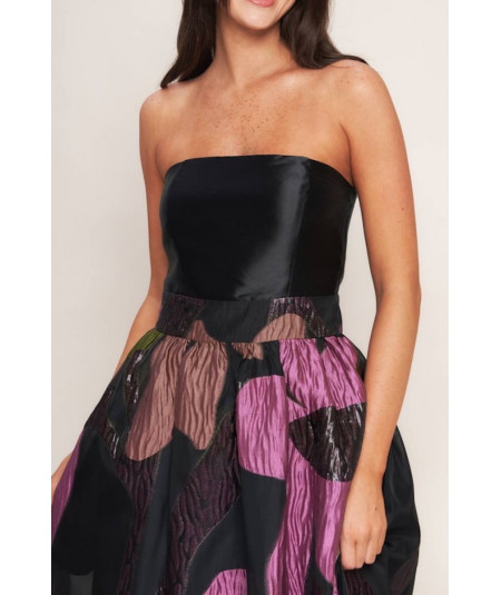 Vestido strapless para mujer en color negro con falda midi de volumen y estampado floral en tonos púrpura, rosa, verde y marrón. La parte superior es lisa y estructurada, mientras que la falda presenta textura y transparencia ligera que aporta un efecto sofisticado. Ideal para eventos, cocteles y ocasiones formales.